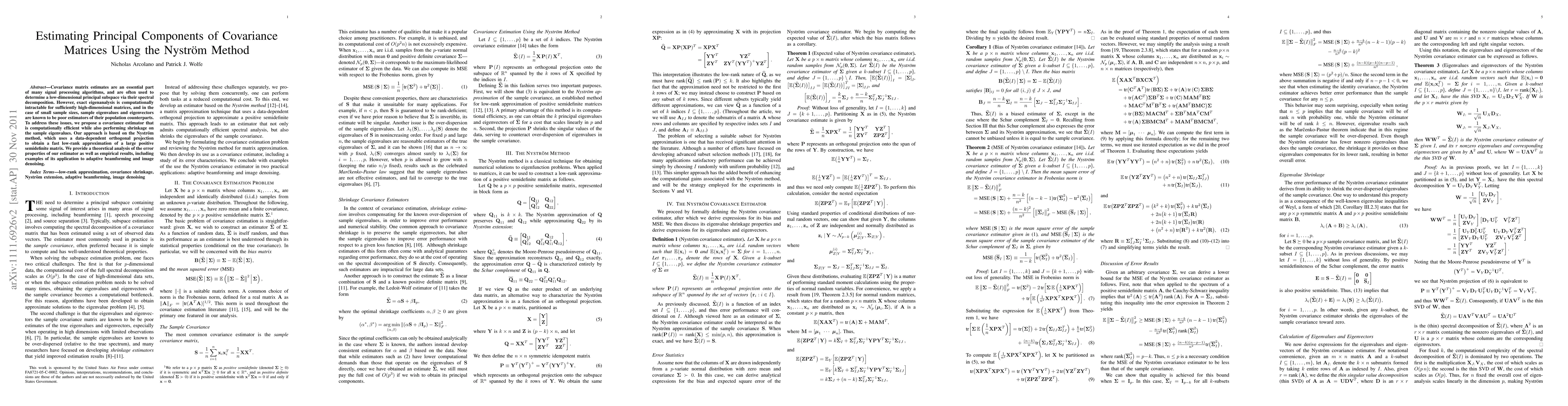 This paper proposes a computationally efficient covariance matrix estimator based on the Nyström method, which provides a low-rank approximation for high-dimensional matrices. The method also performs shrinkage on sample eigenvalues, addressing issues with computational intractability and poor estimation in small sample sizes, and is demonstrated through applications in adaptive beamforming and image denoising.