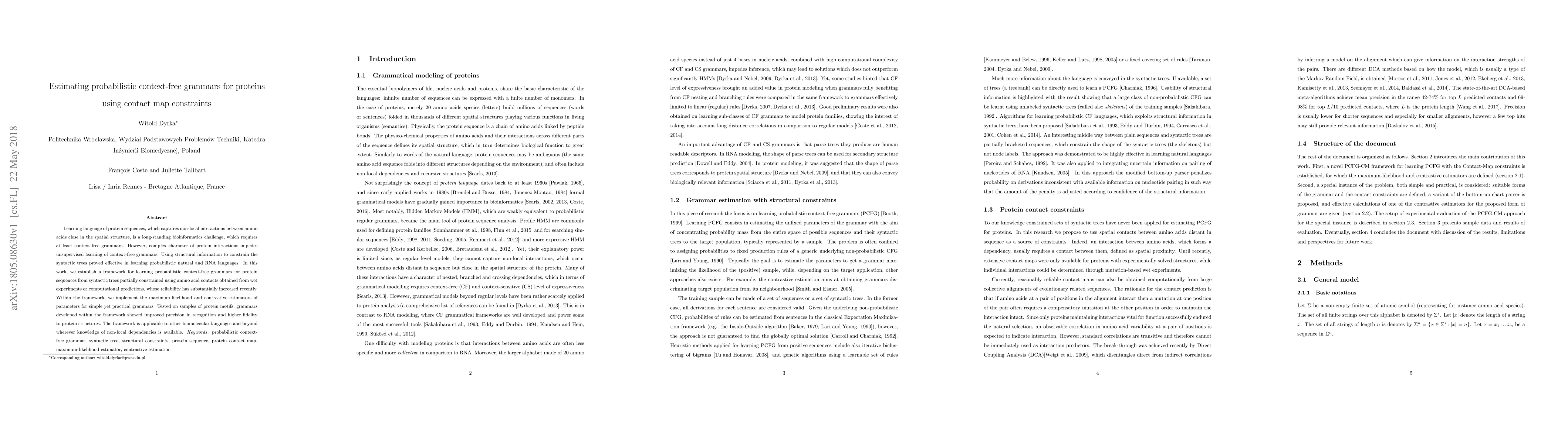 This paper proposes a framework to learn probabilistic context-free grammars for protein sequences, using contact map constraints to improve unsupervised learning. The method shows enhanced recognition precision and structural fidelity, demonstrating potential for broader applications in bioinformatics.