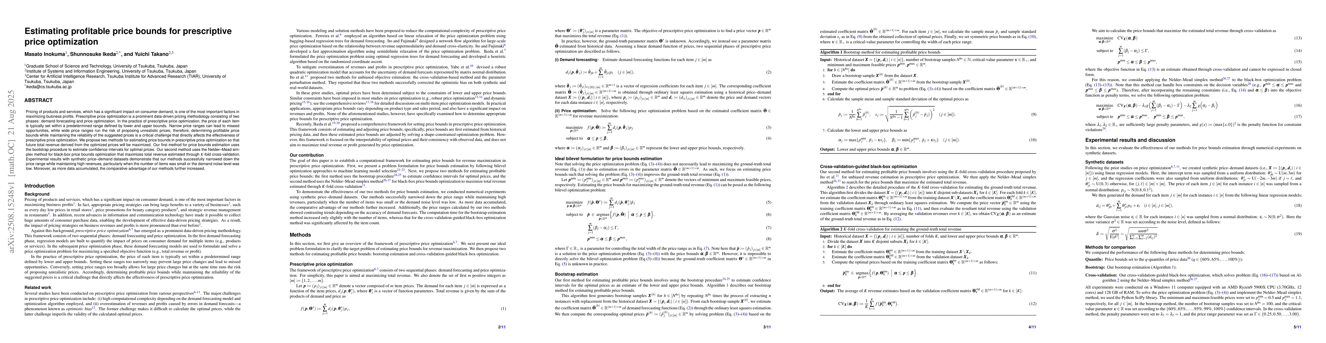 Pricing of products and services, which has a significant impact on consumer demand, is one of the most important factors in maximizing business profits. Prescriptive price optimization is a prominent data-driven pricing methodology consisting of two phases: demand forecasting and price optimization. In the practice of prescriptive price optimization, the price of each item is typically set within a predetermined range defined by lower and upper bounds. Narrow price ranges can lead to missed opportunities, while wide price ranges run the risk of proposing unrealistic prices; therefore, determining profitable price bounds while maintaining the reliability of the suggested prices is a critical challenge that directly affects the effectiveness of prescriptive price optimization. We propose two methods for estimating price bounds in prescriptive price optimization so that future total revenue derived from the optimized prices will be maximized. Our first method for price bounds estimation uses the bootstrap procedure to estimate confidence intervals for optimal prices. Our second method uses the Nelder--Mead simplex method for black-box price bounds optimization that maximizes total revenue estimated through $K$-fold cross-validation. Experimental results with synthetic price--demand datasets demonstrate that our methods successfully narrowed down the price range while maintaining high revenues, particularly when the number of items was small or the demand noise level was low. Moreover, as more data accumulated, the comparative advantage of our methods further increased.