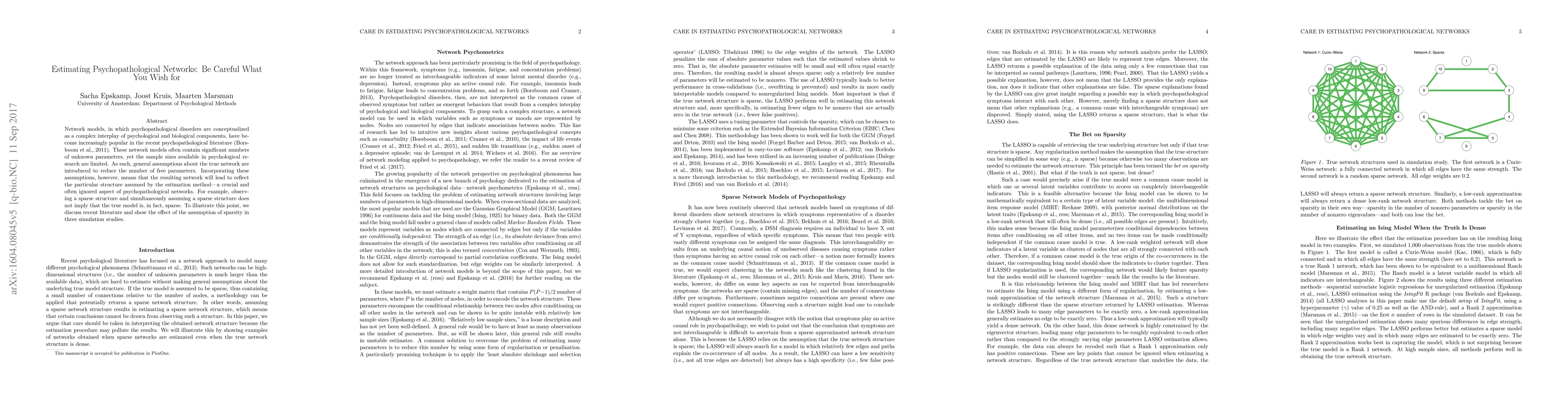Network models, in which psychopathological disorders are conceptualized as a complex interplay of psychological and biological components, have become increasingly popular in the recent psychopathological literature. These network models often contain significant numbers of unknown parameters, yet the sample sizes available in psychological research are limited. As such, general assumptions about the true network are introduced to reduce the number of free parameters. Incorporating these assumptions, however, means that the resulting network will lead to reflect the particular structure assumed by the estimation method---a crucial and often ignored aspect of psychopathological networks. For example, observing a sparse structure and simultaneously assuming a sparse structure does not imply that the true model is, in fact, sparse. To illustrate this point, we discuss recent literature and show the effect of the assumption of sparsity in three simulation studies.