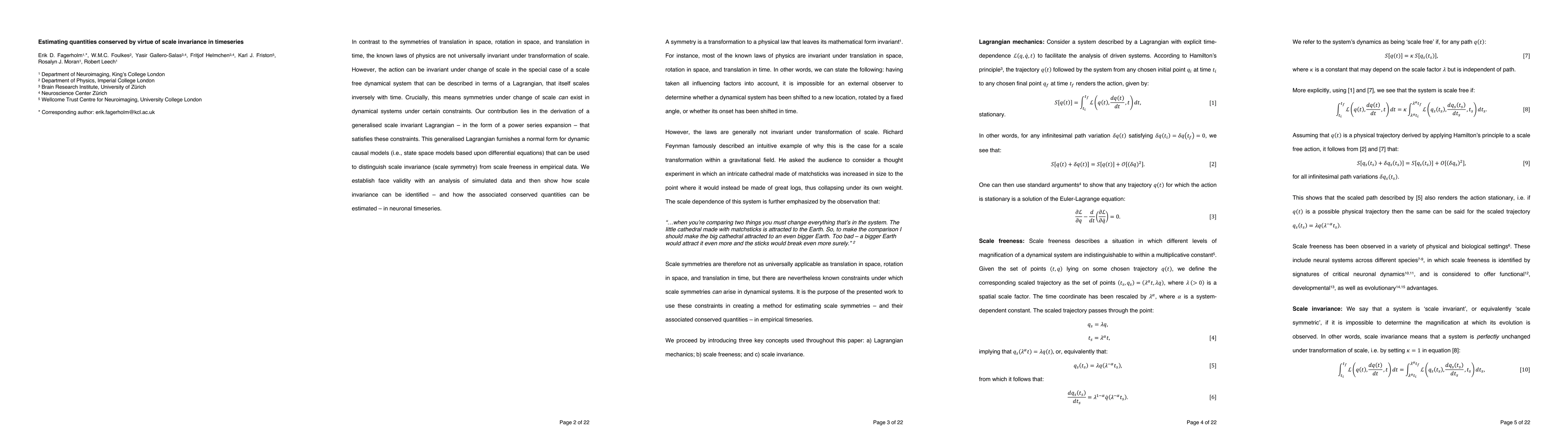 In contrast to the symmetries of translation in space, rotation in space, and translation in time, the known laws of physics are not universally invariant under transformation of scale. However, the action can be invariant under change of scale in the special case of a scale free dynamical system that can be described in terms of a Lagrangian, that itself scales inversely with time. Crucially, this means symmetries under change of scale can exist in dynamical systems under certain constraints. Our contribution lies in the derivation of a generalised scale invariant Lagrangian - in the form of a power series expansion - that satisfies these constraints. This generalised Lagrangian furnishes a normal form for dynamic causal models (i.e., state space models based upon differential equations) that can be used to distinguish scale invariance (scale symmetry) from scale freeness in empirical data. We establish face validity with an analysis of simulated data and then show how scale invariance can be identified - and how the associated conserved quantities can be estimated - in neuronal timeseries.
