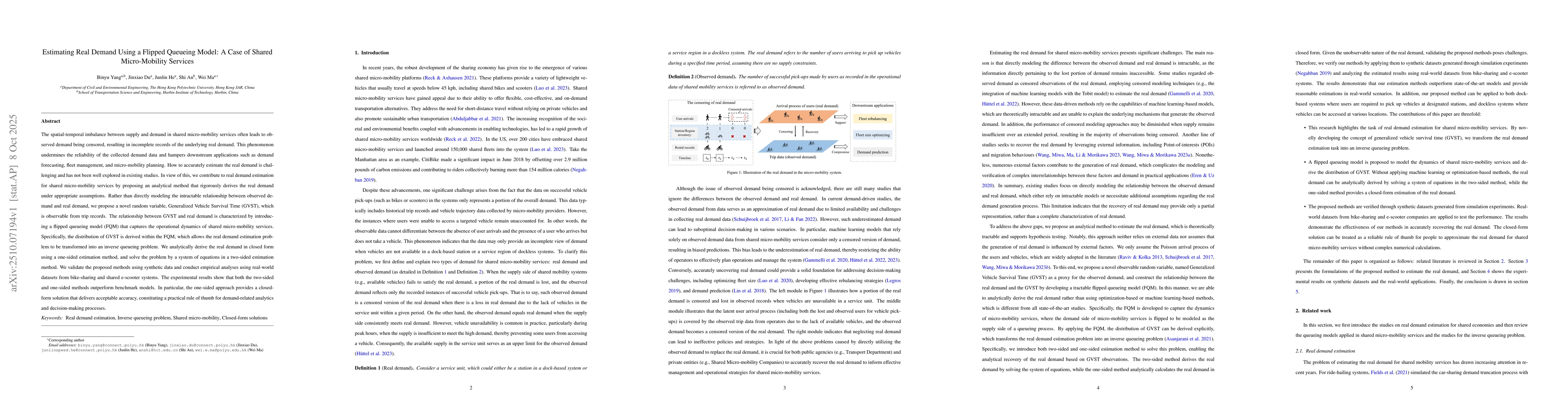 The spatial-temporal imbalance between supply and demand in shared micro-mobility services often leads to observed demand being censored, resulting in incomplete records of the underlying real demand. This phenomenon undermines the reliability of the collected demand data and hampers downstream applications such as demand forecasting, fleet management, and micro-mobility planning. How to accurately estimate the real demand is challenging and has not been well explored in existing studies. In view of this, we contribute to real demand estimation for shared micro-mobility services by proposing an analytical method that rigorously derives the real demand under appropriate assumptions. Rather than directly modeling the intractable relationship between observed demand and real demand, we propose a novel random variable, Generalized Vehicle Survival Time (GVST), which is observable from trip records. The relationship between GVST and real demand is characterized by introducing a flipped queueing model (FQM) that captures the operational dynamics of shared micro-mobility services. Specifically, the distribution of GVST is derived within the FQM, which allows the real demand estimation problem to be transformed into an inverse queueing problem. We analytically derive the real demand in closed form using a one-sided estimation method, and solve the problem by a system of equations in a two-sided estimation method. We validate the proposed methods using synthetic data and conduct empirical analyses using real-world datasets from bike-sharing and shared e-scooter systems. The experimental results show that both the two-sided and one-sided methods outperform benchmark models. In particular, the one-sided approach provides a closed-form solution that delivers acceptable accuracy, constituting a practical rule of thumb for demand-related analytics and decision-making processes.