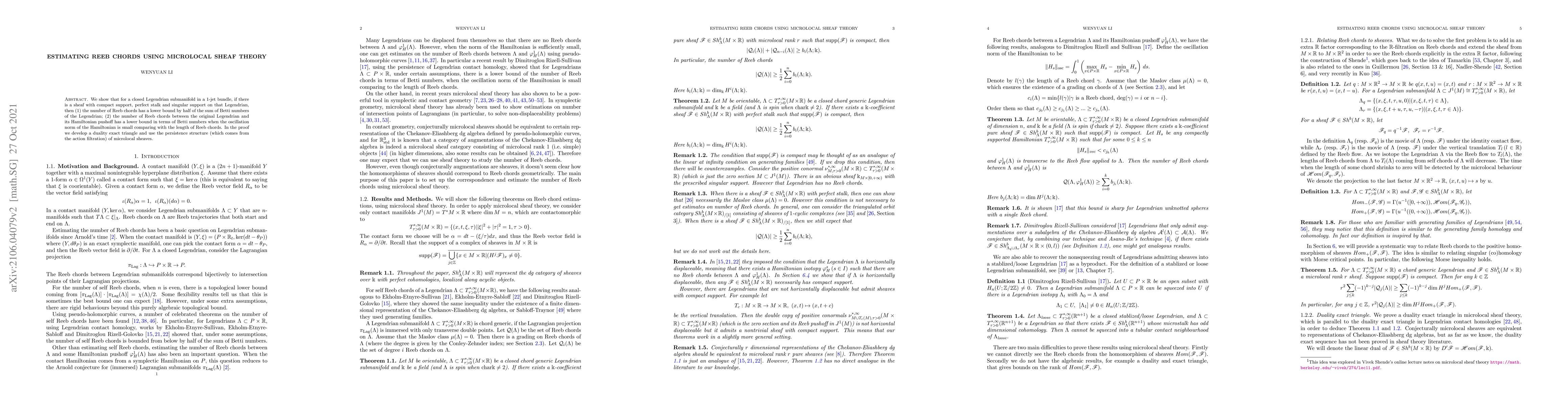 This paper demonstrates that for closed Legendrian submanifolds in a 1-jet bundle, the existence of certain microlocal sheaves ensures a lower bound on the number of Reeb chords, relating it to the Betti numbers of the Legendrian, and also provides a lower bound for Reeb chords between the original Legendrian and its Hamiltonian pushoff under small oscillation conditions. The proof utilizes a duality exact triangle and microlocal sheaf persistence structure.