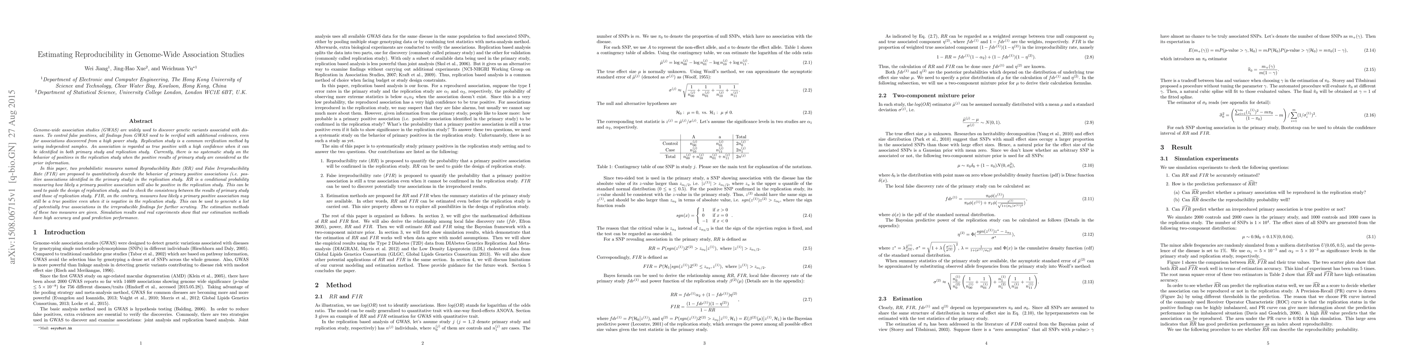 This paper proposes two probabilistic measures, Reproducibility Rate (RR) and False Irreproducibility Rate (FIR), to assess the reproducibility of positive associations in genome-wide association studies (GWAS). RR evaluates the likelihood of primary positive associations being confirmed in replication studies, while FIR identifies potentially true associations among irreproducible findings. The proposed methods demonstrate high accuracy and predictive performance.