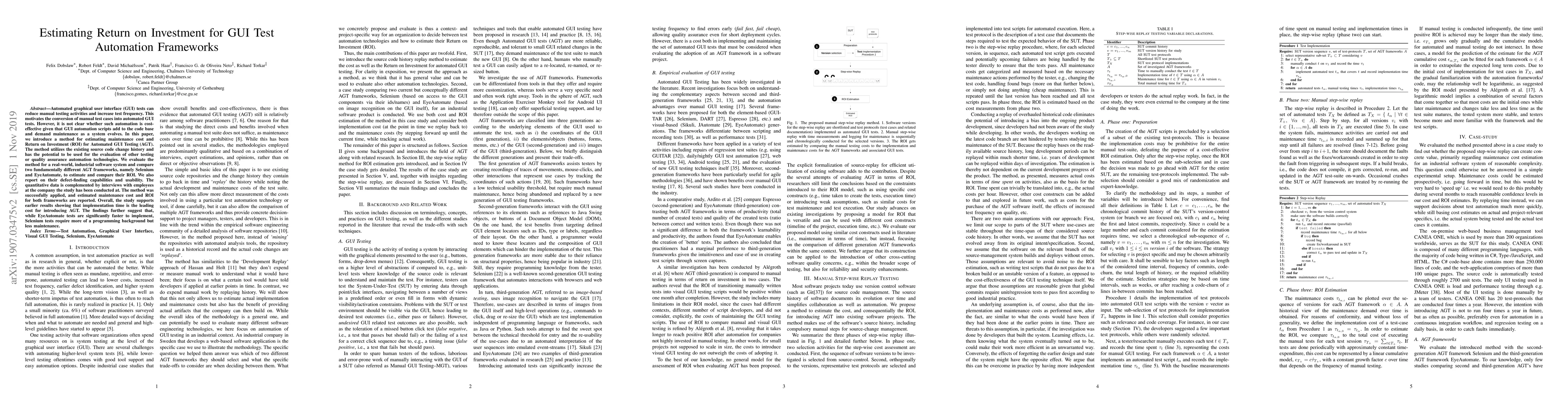This paper proposes a method to estimate the maintenance cost and ROI for Automated GUI Testing tools, applying it to evaluate Selenium and EyeAutomate. The study found that while EyeAutomate tests are quicker to implement, Selenium requires more programming expertise but incurs less maintenance, supporting the notion that implementation time is the primary cost factor in AGT.