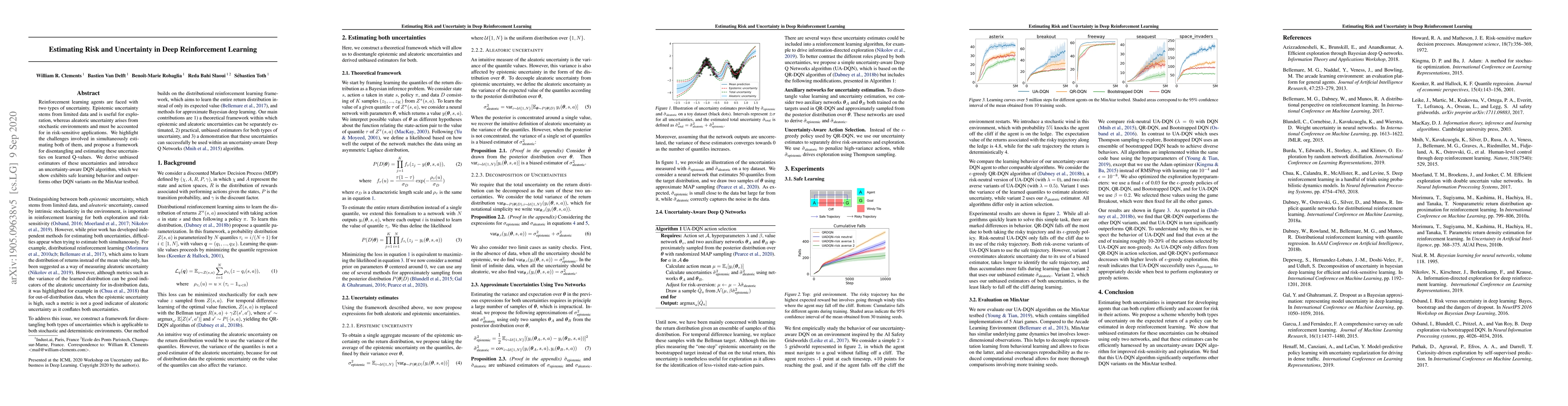 Reinforcement learning agents are faced with two types of uncertainty. Epistemic uncertainty stems from limited data and is useful for exploration, whereas aleatoric uncertainty arises from stochastic environments and must be accounted for in risk-sensitive applications. We highlight the challenges involved in simultaneously estimating both of them, and propose a framework for disentangling and estimating these uncertainties on learned Q-values. We derive unbiased estimators of these uncertainties and introduce an uncertainty-aware DQN algorithm, which we show exhibits safe learning behavior and outperforms other DQN variants on the MinAtar testbed.