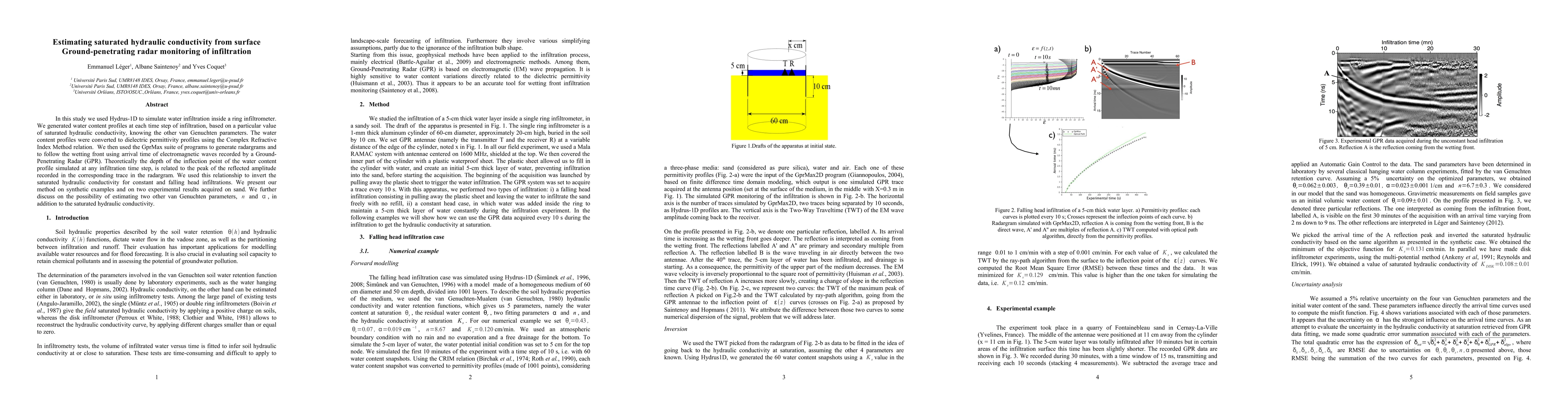 This paper explores estimating saturated hydraulic conductivity using surface Ground-Penetrating Radar (GPR) monitoring of infiltration, simulating water infiltration with Hydrus-1D and converting water content profiles to dielectric permittivity profiles. The study demonstrates a method to invert conductivity values from radargrams and discusses the potential to estimate additional soil hydraulic parameters.