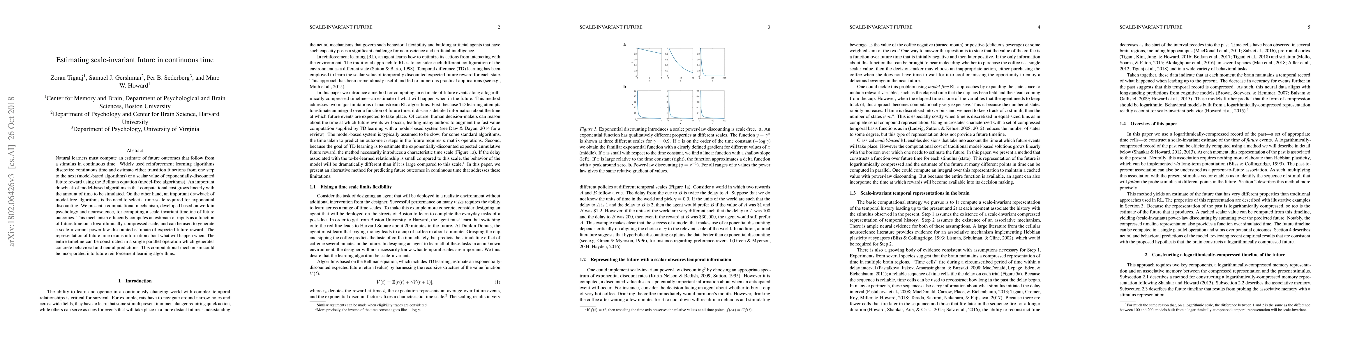 Natural learners must compute an estimate of future outcomes that follow from a stimulus in continuous time. Widely used reinforcement learning algorithms discretize continuous time and estimate either transition functions from one step to the next (model-based algorithms) or a scalar value of exponentially-discounted future reward using the Bellman equation (model-free algorithms). An important drawback of model-based algorithms is that computational cost grows linearly with the amount of time to be simulated. On the other hand, an important drawback of model-free algorithms is the need to select a time-scale required for exponential discounting. We present a computational mechanism, developed based on work in psychology and neuroscience, for computing a scale-invariant timeline of future outcomes. This mechanism efficiently computes an estimate of inputs as a function of future time on a logarithmically-compressed scale, and can be used to generate a scale-invariant power-law-discounted estimate of expected future reward. The representation of future time retains information about what will happen when. The entire timeline can be constructed in a single parallel operation which generates concrete behavioral and neural predictions. This computational mechanism could be incorporated into future reinforcement learning algorithms.