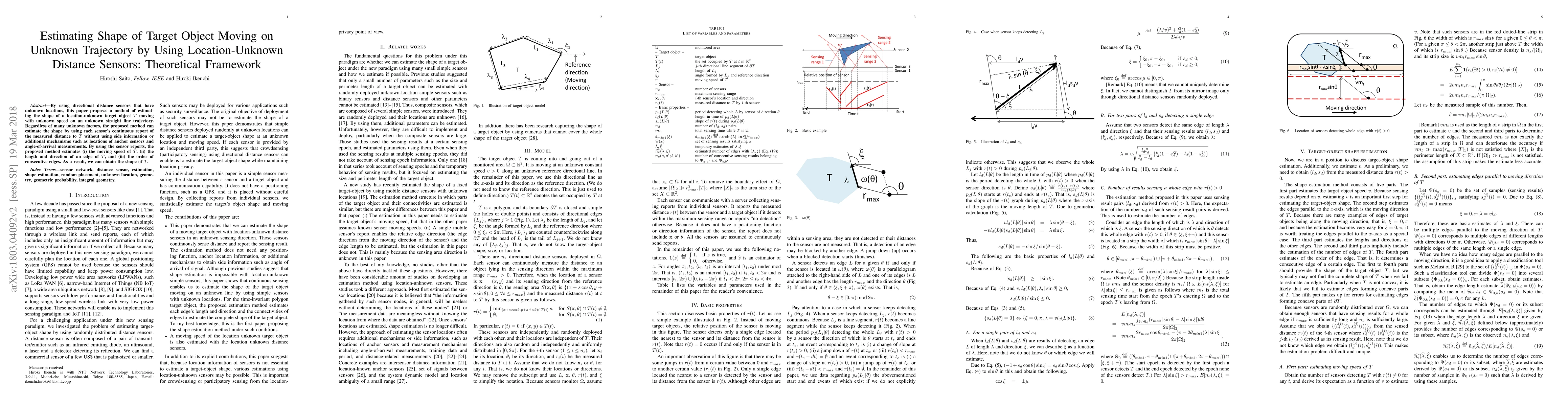 This paper proposes a method to estimate the shape of a moving target object using directional distance sensors with unknown locations, estimating the target's speed, edge length and direction, and the order of edges based solely on continuous distance reports, without requiring additional information.