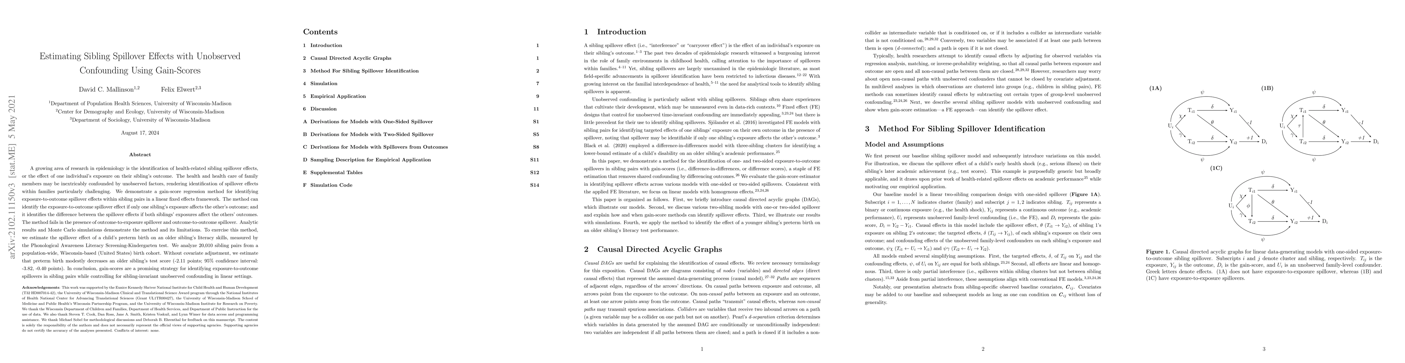This study uses a gain-score regression method to identify sibling spillover effects in health outcomes, controlling for unobserved confounding, and found that preterm birth modestly decreases an older sibling's literacy skills.