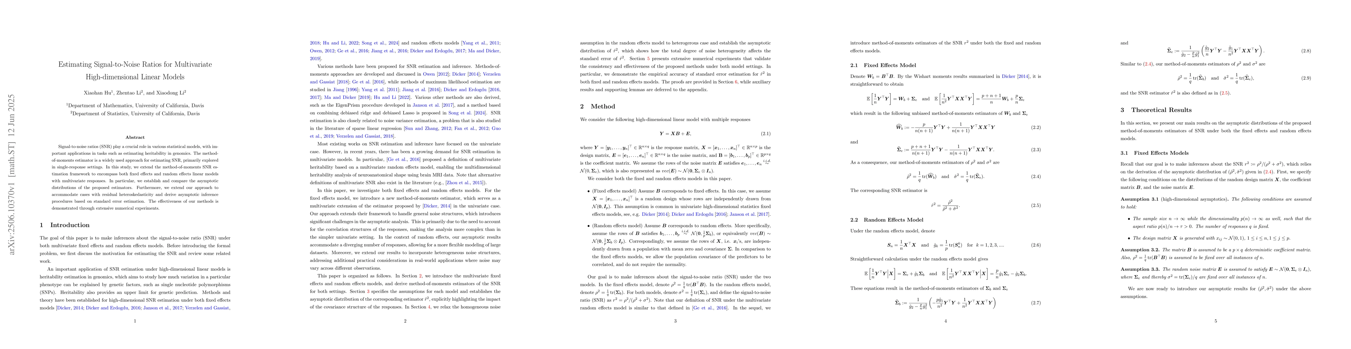 This study develops a method for estimating signal-to-noise ratios in multivariate high-dimensional linear models with fixed effects and random effects, improving upon existing single-response approaches and accounting for residual heteroskedasticity.