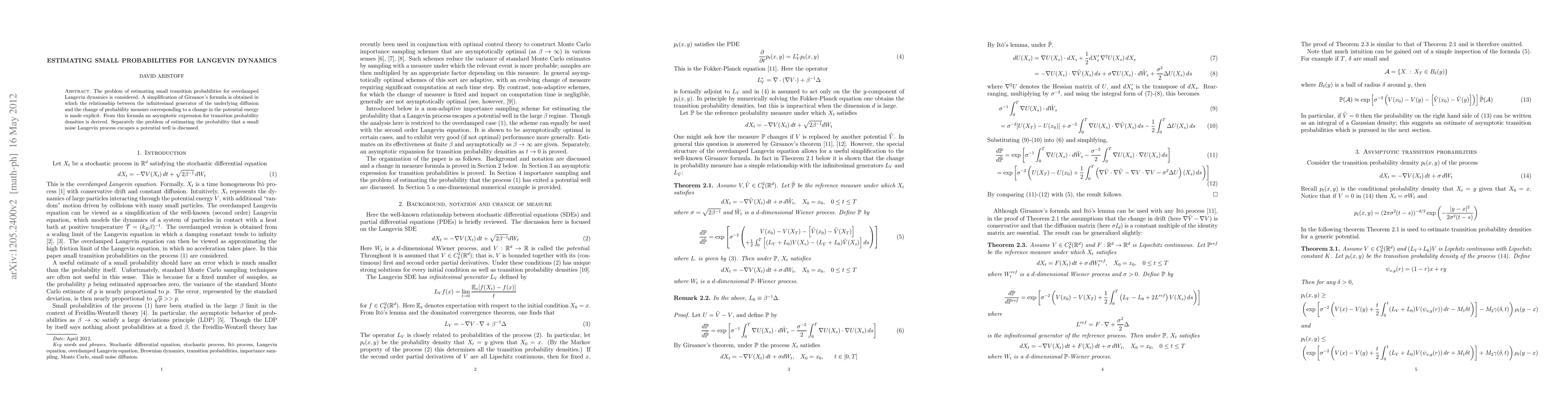 The problem of estimating small transition probabilities for overdamped Langevin dynamics is considered. A simplification of Girsanov's formula is obtained in which the relationship between the infinitesimal generator of the underlying diffusion and the change of probability measure corresponding to a change in the potential energy is made explicit. From this formula an asymptotic expression for transition probability densities is derived. Separately the problem of estimating the probability that a small noise Langevin process excapes a potential well is discussed.