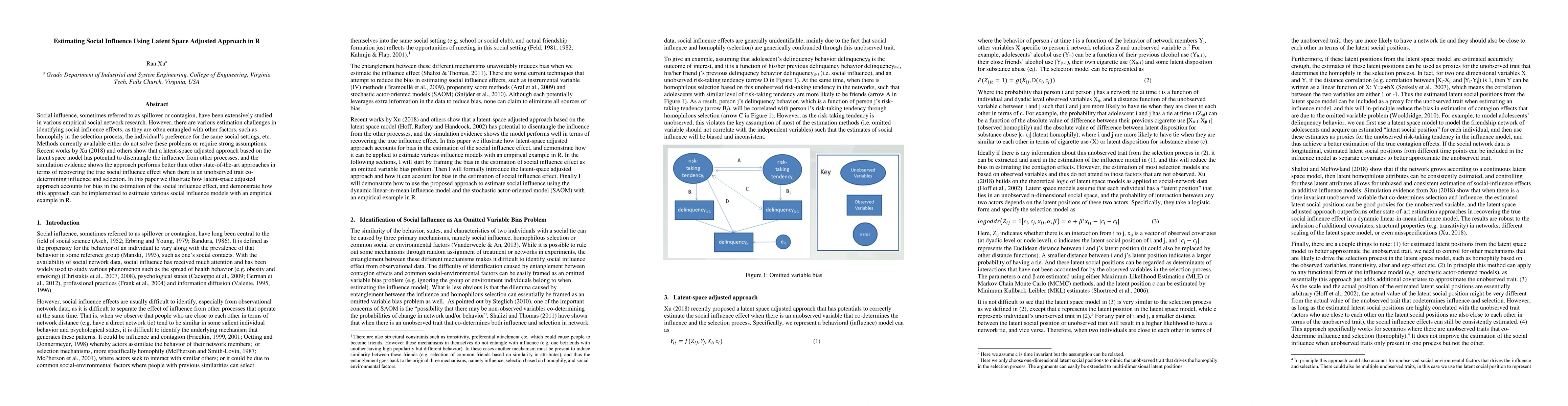 Social influence, sometimes referred to as spillover or contagion, have been extensively studied in various empirical social network research. However, there are various estimation challenges in identifying social influence effects, as they are often entangled with other factors, such as homophily in the selection process, the individual's preference for the same social settings, etc. Methods currently available either do not solve these problems or require strong assumptions. Recent works by Xu 2018 and others show that a latent-space adjusted approach based on the latent space model has potential to disentangle the influence from other processes, and the simulation evidence shows the approach performs better than other state-of-the-art approaches in terms of recovering the true social influence effect when there is an unobserved trait co-determining influence and selection. In this paper we illustrate how latent space adjusted approach accounts for bias in the estimation of the social influence effect, and demonstrate how this approach can be implemented to estimate various social influence models with an empirical example in R.