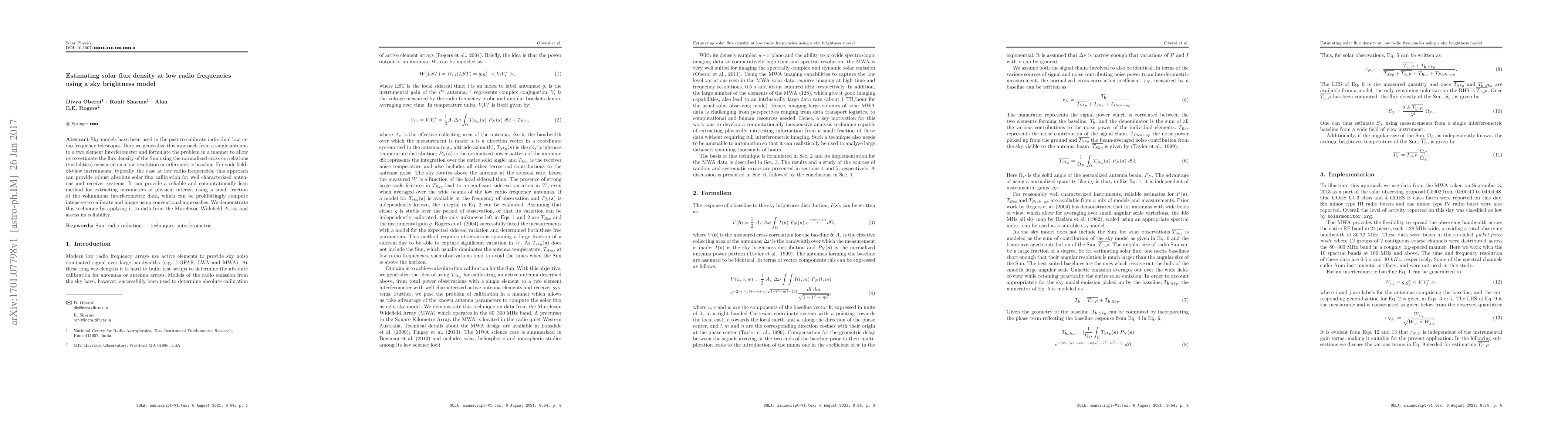 This paper proposes a method to estimate solar flux density at low radio frequencies using sky brightness models and normalized cross-correlations from a two-element interferometer. It demonstrates a robust, computationally efficient approach for absolute solar flux calibration, validated with data from the Murchison Widefield Array.