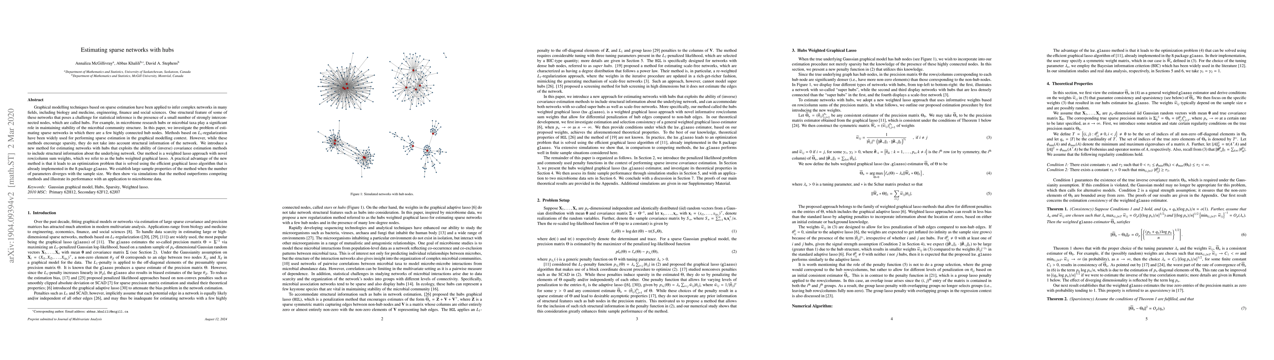 This paper introduces a new weighted lasso method called the hubs weighted graphical lasso to estimate sparse networks with hubs, addressing the limitations of existing L1-regularization techniques. The proposed method incorporates structural information and is evaluated through simulations and an application to microbiome data.