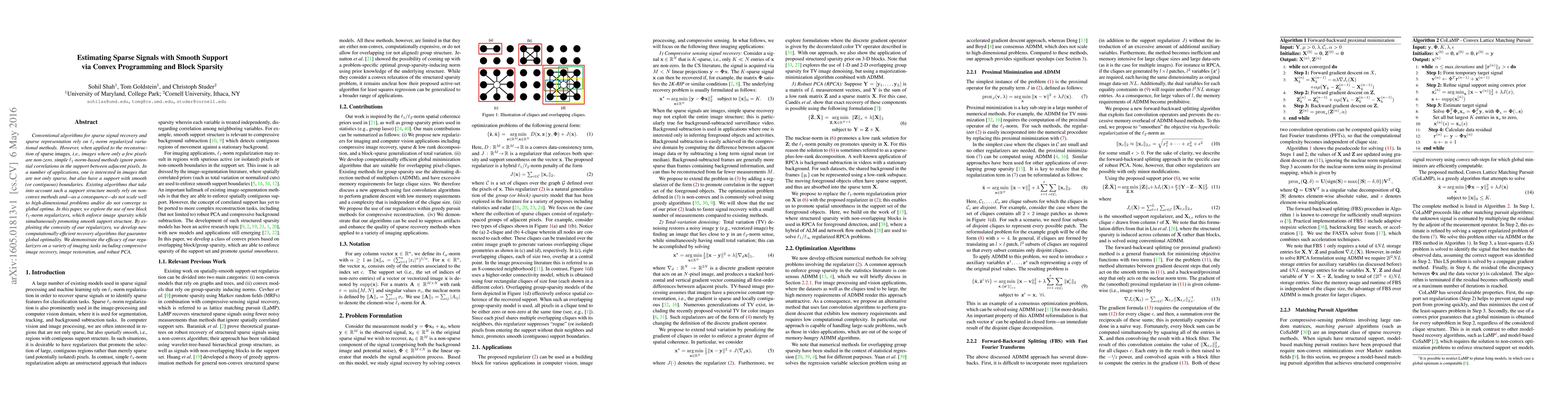 Conventional algorithms for sparse signal recovery and sparse representation rely on $l_1$-norm regularized variational methods. However, when applied to the reconstruction of $\textit{sparse images}$, i.e., images where only a few pixels are non-zero, simple $l_1$-norm-based methods ignore potential correlations in the support between adjacent pixels. In a number of applications, one is interested in images that are not only sparse, but also have a support with smooth (or contiguous) boundaries. Existing algorithms that take into account such a support structure mostly rely on non-convex methods and---as a consequence---do not scale well to high-dimensional problems and/or do not converge to global optima. In this paper, we explore the use of new block $l_1$-norm regularizers, which enforce image sparsity while simultaneously promoting smooth support structure. By exploiting the convexity of our regularizers, we develop new computationally-efficient recovery algorithms that guarantee global optimality. We demonstrate the efficacy of our regularizers on a variety of imaging tasks including compressive image recovery, image restoration, and robust PCA.