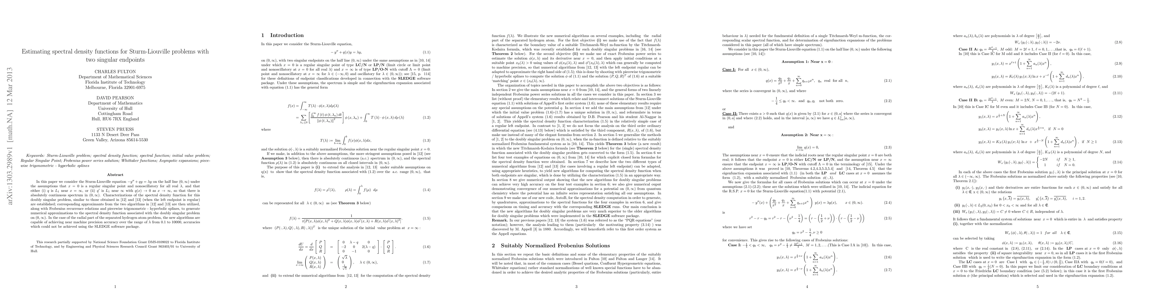 In this paper we consider the Sturm-Liouville equation -y"+qy = lambda*y on the half line (0,infinity) under the assumptions that x=0 is a regular singular point and nonoscillatory for all real lambda, and that either (i) q is L_1 near x=infinity, or (ii) q' is L_1 near infinity with q(x) --> 0 as x --> infinity, so that there is absolutely continuous spectrum in (0,infinity). Characterizations of the spectral density function for this doubly singular problem, similar to those obtained in [12] and [13] (when the left endpoint is regular) are established; corresponding approximants from the two algorithms in [12] and [13] are then utilized, along with the Frobenius recurrence relations and piecewise trigonometric - hyperbolic splines, to generate numerical approximations to the spectral density function associated with the doubly singular problem on (0,infinity). In the case of the radial part of the separated hydrogen atom problem, the new algorithms are capable of achieving near machine precision accuracy over the range of lambda from 0.1 to 10000, accuracies which could not be achieved using the SLEDGE software package.