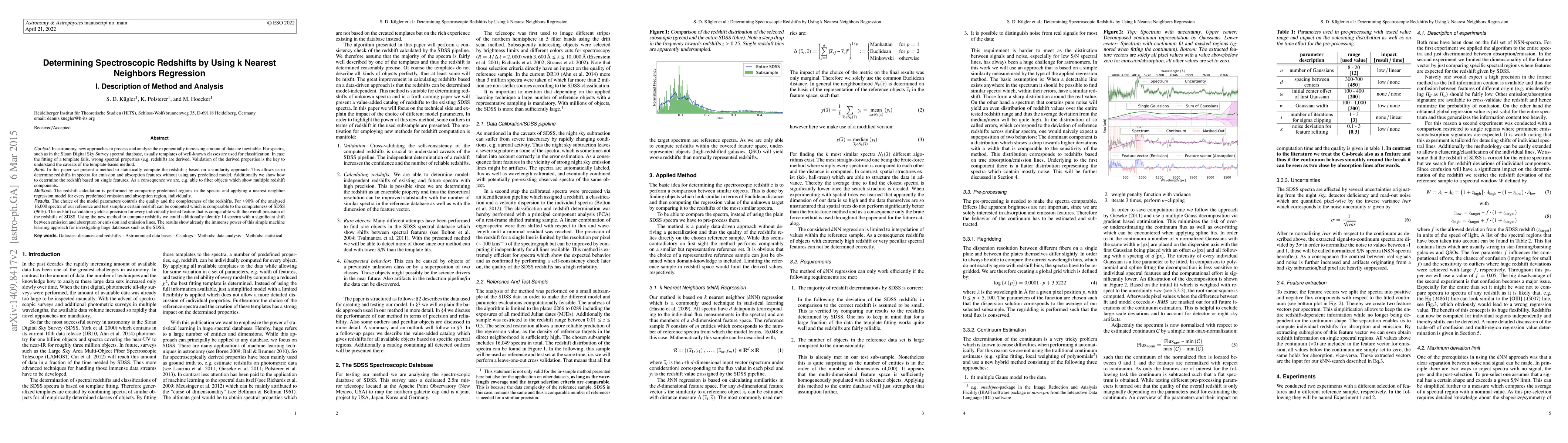 Context: In astronomy, new approaches to process and analyze the exponentially increasing amount of data are inevitable. While classical approaches (e.g. template fitting) are fine for objects of well-known classes, alternative techniques have to be developed to determine those that do not fit. Therefore a classification scheme should be based on individual properties instead of fitting to a global model and therefore loose valuable information. An important issue when dealing with large data sets is the outlier detection which at the moment is often treated problem-orientated. Aims: In this paper we present a method to statistically estimate the redshift z based on a similarity approach. This allows us to determine redshifts in spectra in emission as well as in absorption without using any predefined model. Additionally we show how an estimate of the redshift based on single features is possible. As a consequence we are e.g. able to filter objects which show multiple redshift components. We propose to apply this general method to all similar problems in order to identify objects where traditional approaches fail. Methods: The redshift estimation is performed by comparing predefined regions in the spectra and applying a k nearest neighbor regression model for every predefined emission and absorption region, individually. Results: We estimated a redshift for more than 50% of the analyzed 16,000 spectra of our reference and test sample. The redshift estimate yields a precision for every individually tested feature that is comparable with the overall precision of the redshifts of SDSS. In 14 spectra we find a significant shift between emission and absorption or emission and emission lines. The results show already the immense power of this simple machine learning approach for investigating huge databases such as the SDSS.