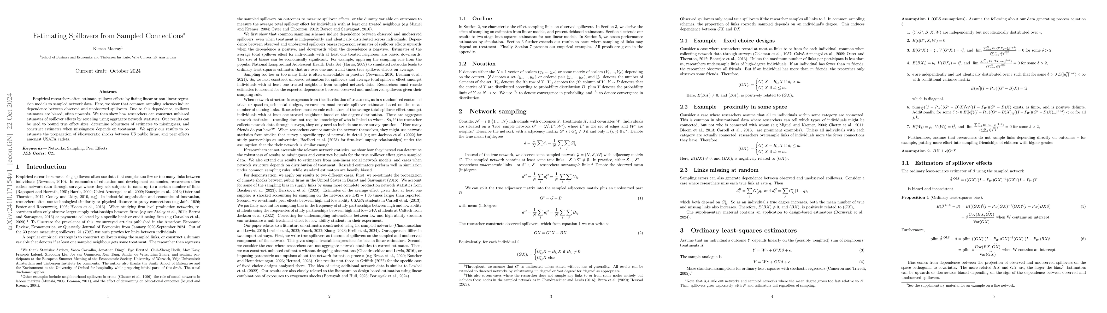 The paper identifies bias in spillover effect estimates due to dependence between sampled and unsampled spillovers, and proposes a rescaling method using aggregate network statistics for unbiased estimation. The method is demonstrated on examples of shocks between US public firms and peer effects among USAFA cadets.