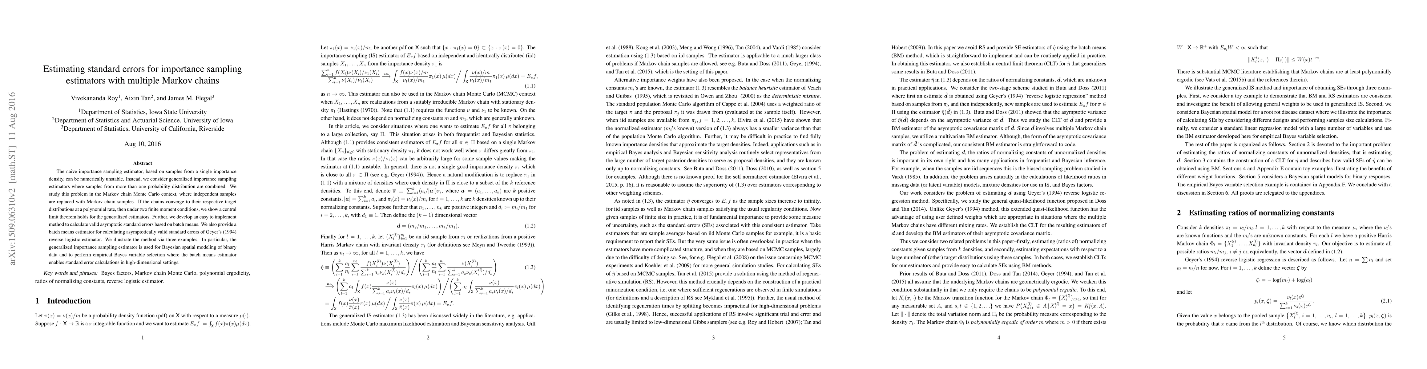 The naive importance sampling estimator, based on samples from a single importance density, can be numerically unstable. Instead, we consider generalized importance sampling estimators where samples from more than one probability distribution are combined. We study this problem in the Markov chain Monte Carlo context, where independent samples are replaced with Markov chain samples. If the chains converge to their respective target distributions at a polynomial rate, then under two finite moment conditions, we show a central limit theorem holds for the generalized estimators. Further, we develop an easy to implement method to calculate valid asymptotic standard errors based on batch means. We also provide a batch means estimator for calculating asymptotically valid standard errors of Geyer(1994) reverse logistic estimator. We illustrate the method using a Bayesian variable selection procedure in linear regression. In particular, the generalized importance sampling estimator is used to perform empirical Bayes variable selection and the batch means estimator is used to obtain standard errors in a high-dimensional setting where current methods are not applicable.