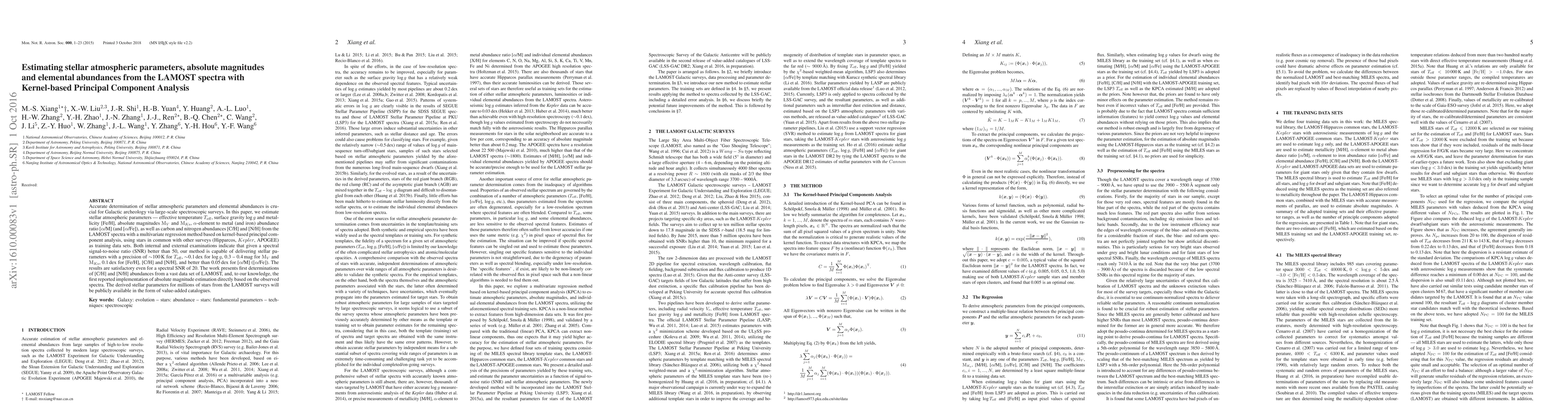 This paper estimates stellar atmospheric parameters, elemental abundances, and absolute magnitudes from LAMOST spectra using kernel-based principal component analysis. The method achieves high precision, even with moderate signal-to-noise ratios, and provides first estimates of carbon and nitrogen abundances from LAMOST data.