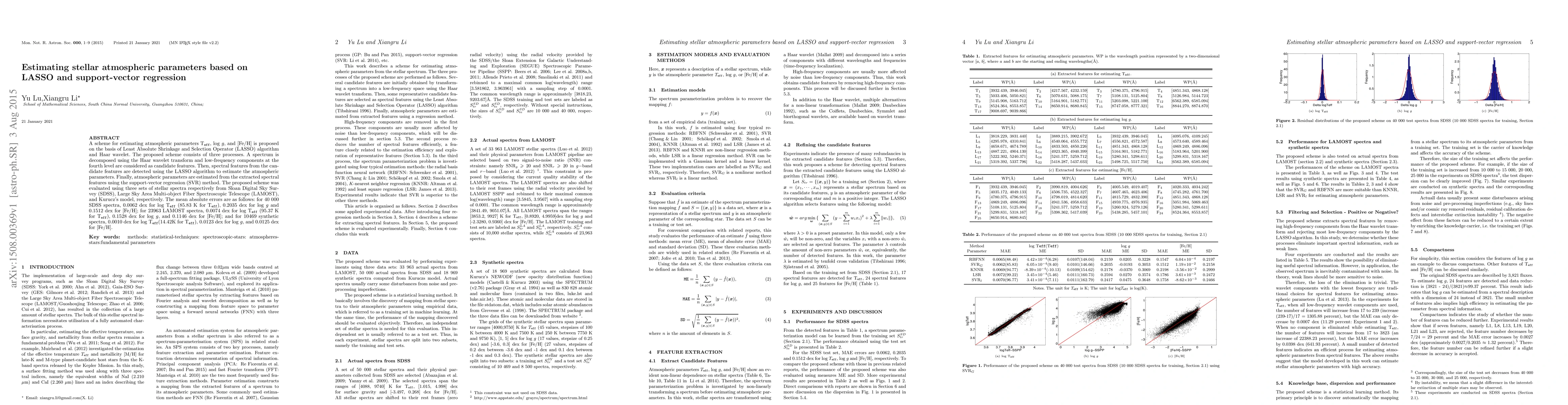 This paper proposes a method using LASSO and support-vector regression to estimate stellar atmospheric parameters, employing Haar wavelet transforms to extract spectral features. Evaluations on SDSS, LAMOST, and Kurucz spectra show mean absolute errors for T$_{eff}$, log~$g$, and [Fe/H].