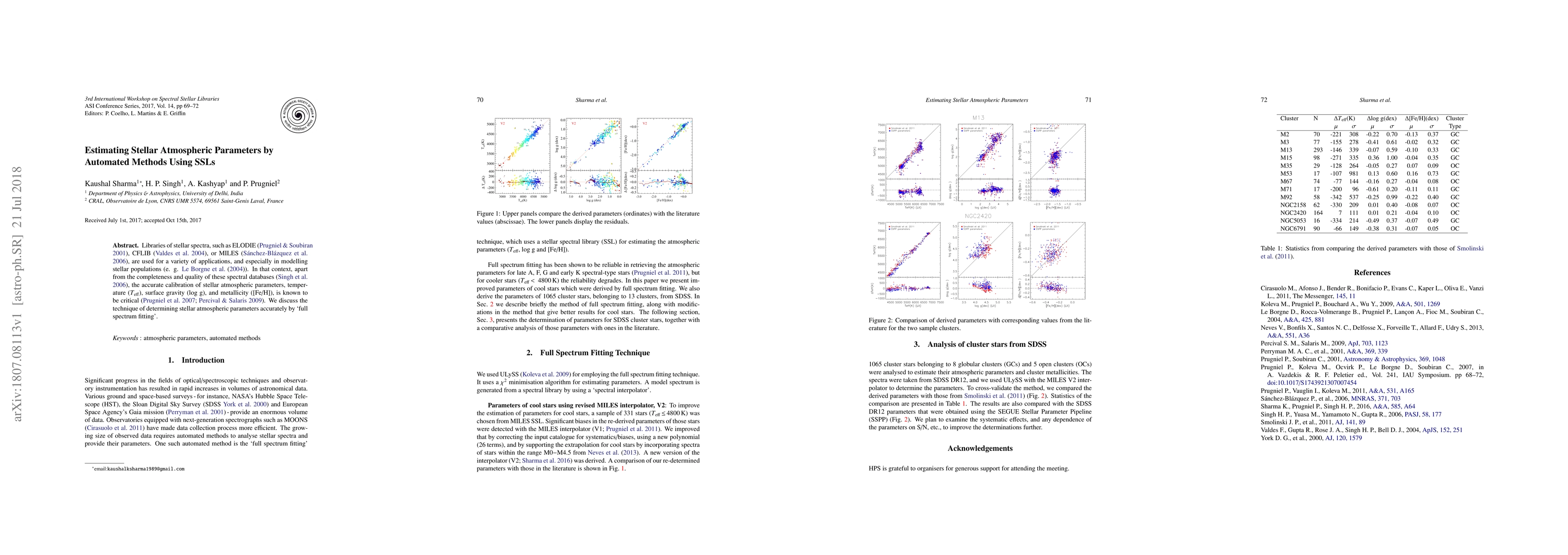 Libraries of stellar spectra, such as ELODIE (Prugniel & Soubiran 2001), CFLIB (Valdes et al. 2004), or MILES (S\'anchez-Bl\'azquez et al. 2006), are used for a variety of applications, and especially in modelling stellar populations (e. g. Le Borgne et al. (2004)). In that context, apart from the completeness and quality of these spectral databases (Singh et al. 2006), the accurate calibration of stellar atmospheric parameters, temperature (Teff), surface gravity (log g), and metallicity ([Fe/H]), is known to be critical (Prugniel et al. 2007; Percival & Salaris 2009). We discuss the technique of determining stellar atmospheric parameters accurately by `full spectrum fitting'.