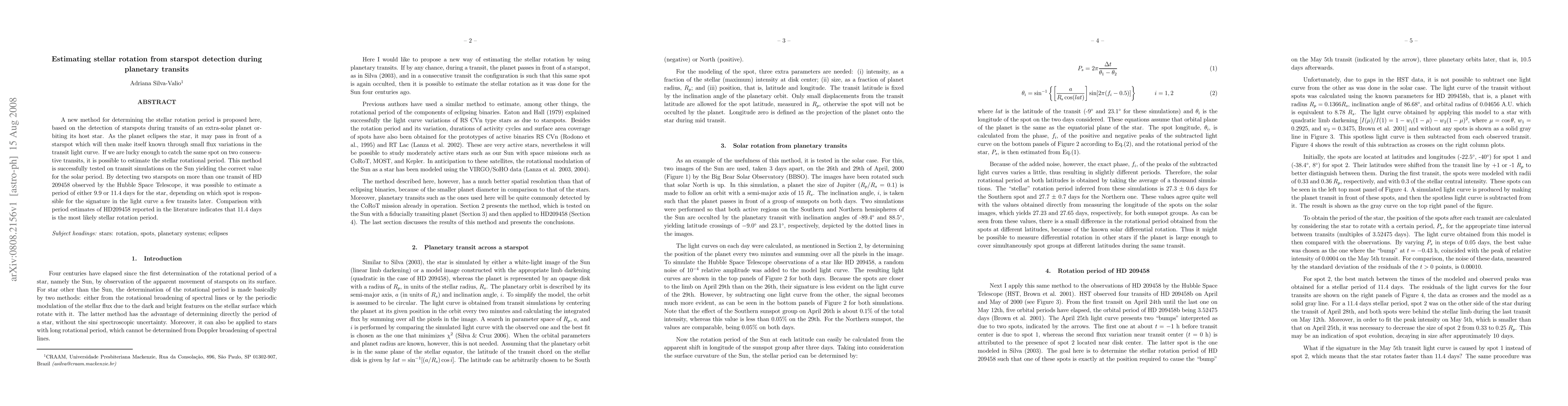 This paper proposes a novel method for estimating stellar rotation periods by detecting starspots during extra-solar planet transits, which cause flux variations in the transit light curve. The method was tested on the Sun and successfully applied to HD 209458, yielding a likely stellar rotation period of 11.4 days.
