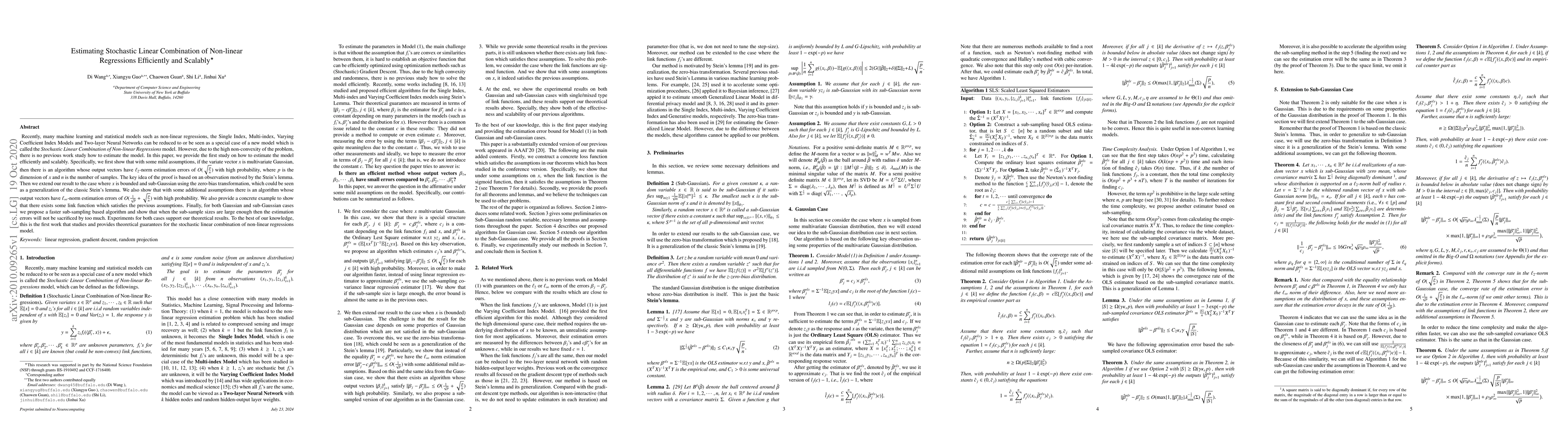 This paper introduces the first study on estimating the Stochastic Linear Combination of Non-linear Regressions model efficiently and scalably. It proposes algorithms with theoretical guarantees for estimation errors under Gaussian and sub-Gaussian distributions, and demonstrates faster sub-sampling based methods to maintain accuracy.