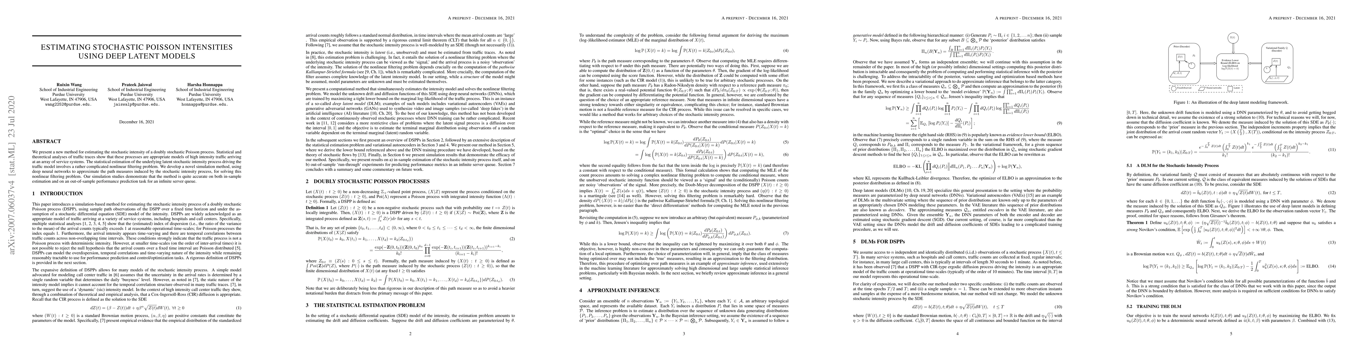 We present methodology for estimating the stochastic intensity of a doubly stochastic Poisson process. Statistical and theoretical analyses of traffic traces show that these processes are appropriate models of high intensity traffic arriving at an array of service systems. The statistical estimation of the underlying latent stochastic intensity process driving the traffic model involves a rather complicated nonlinear filtering problem. We develop a novel simulation methodology, using deep neural networks to approximate the path measures induced by the stochastic intensity process, for solving this nonlinear filtering problem. Our simulation studies demonstrate that the method is quite accurate on both in-sample estimation and on an out-of-sample performance prediction task for an infinite server queue.