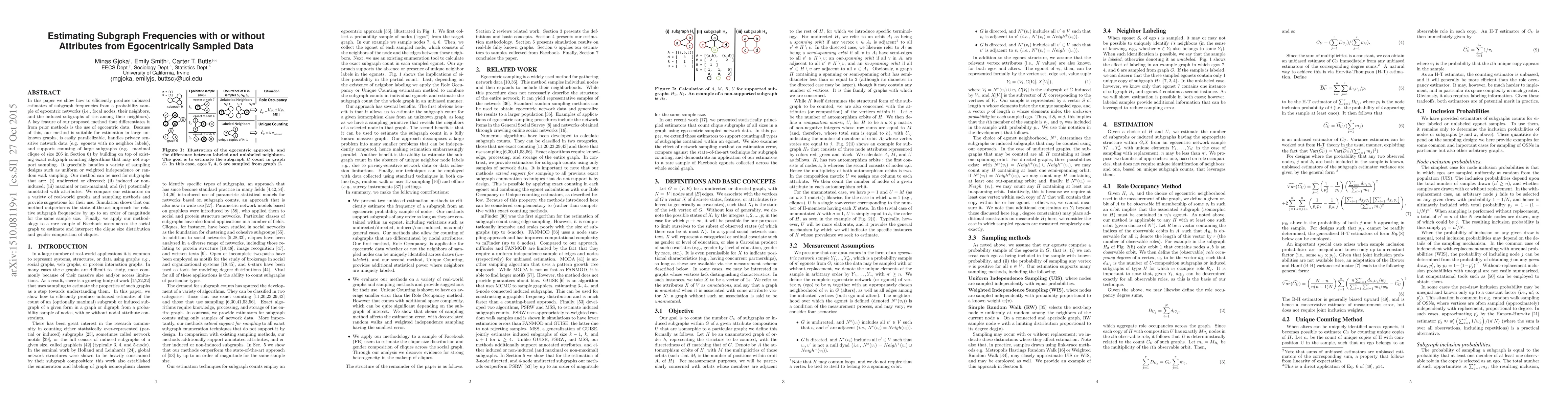 In this paper we show how to efficiently produce unbiased estimates of subgraph frequencies from a probability sample of egocentric networks (i.e., focal nodes, their neighbors, and the induced subgraphs of ties among their neighbors). A key feature of our proposed method that differentiates it from prior methods is the use of egocentric data. Because of this, our method is suitable for estimation in large unknown graphs, is easily parallelizable, handles privacy sensitive network data (e.g. egonets with no neighbor labels), and supports counting of large subgraphs (e.g. maximal clique of size 205 in Section 6) by building on top of existing exact subgraph counting algorithms that may not support sampling. It gracefully handles a variety of sampling designs such as uniform or weighted independence or random walk sampling. Our method can be used for subgraphs that are: (i) undirected or directed; (ii) induced or non-induced; (iii) maximal or non-maximal; and (iv) potentially annotated with attributes. We compare our estimators on a variety of real-world graphs and sampling methods and provide suggestions for their use. Simulation shows that our method outperforms the state-of-the-art approach for relative subgraph frequencies by up to an order of magnitude for the same sample size. Finally, we apply our methodology to a rare sample of Facebook users across the social graph to estimate and interpret the clique size distribution and gender composition of cliques.