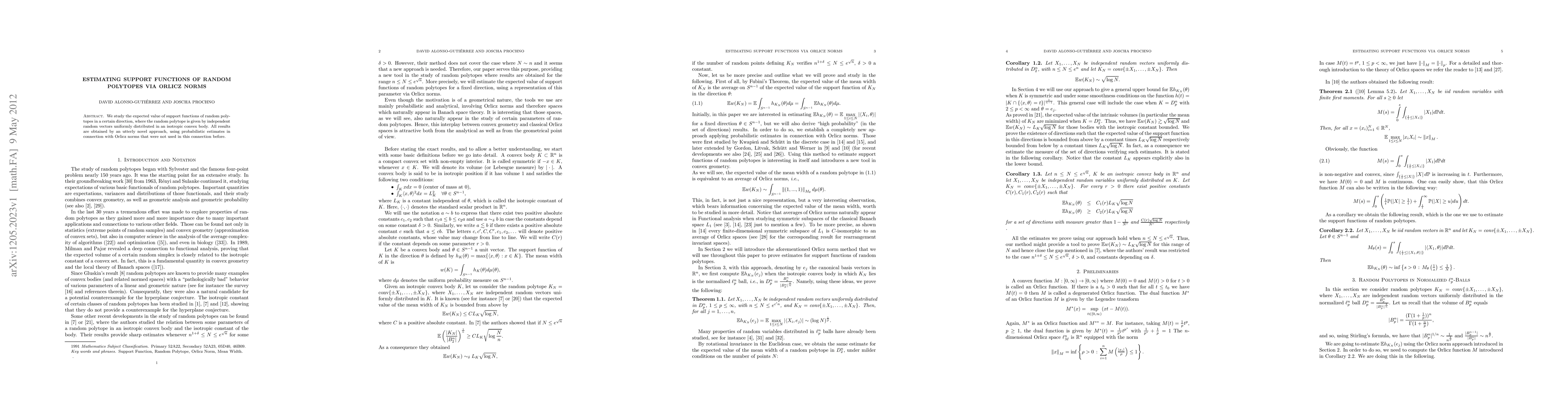 This paper introduces a novel method using probabilistic estimates and Orlicz norms to estimate the expected support functions of random polytopes formed by independent random vectors uniformly distributed in an isotropic convex body. The approach provides new insights into the behavior of these random polytopes in specific directions.