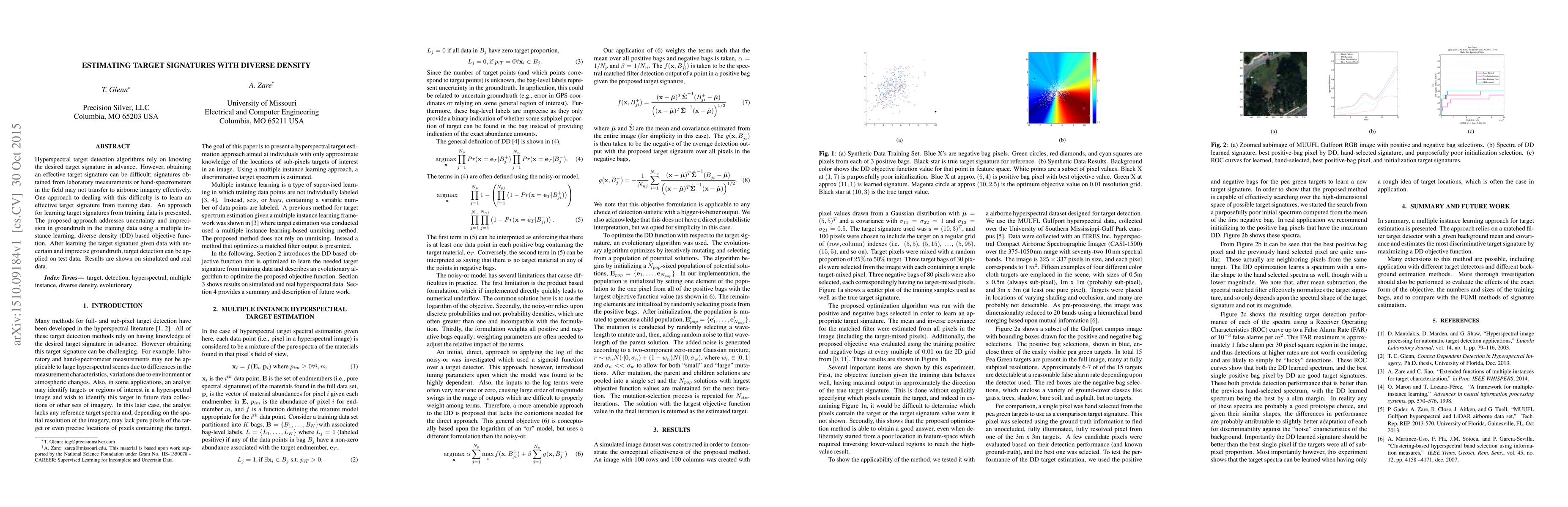 Hyperspectral target detection algorithms rely on knowing the desired target signature in advance. However, obtaining an effective target signature can be difficult; signatures obtained from laboratory measurements or hand-spectrometers in the field may not transfer to airborne imagery effectively. One approach to dealing with this difficulty is to learn an effective target signature from training data. An approach for learning target signatures from training data is presented. The proposed approach addresses uncertainty and imprecision in groundtruth in the training data using a multiple instance learning, diverse density (DD) based objective function. After learning the target signature given data with uncertain and imprecise groundtruth, target detection can be applied on test data. Results are shown on simulated and real data.