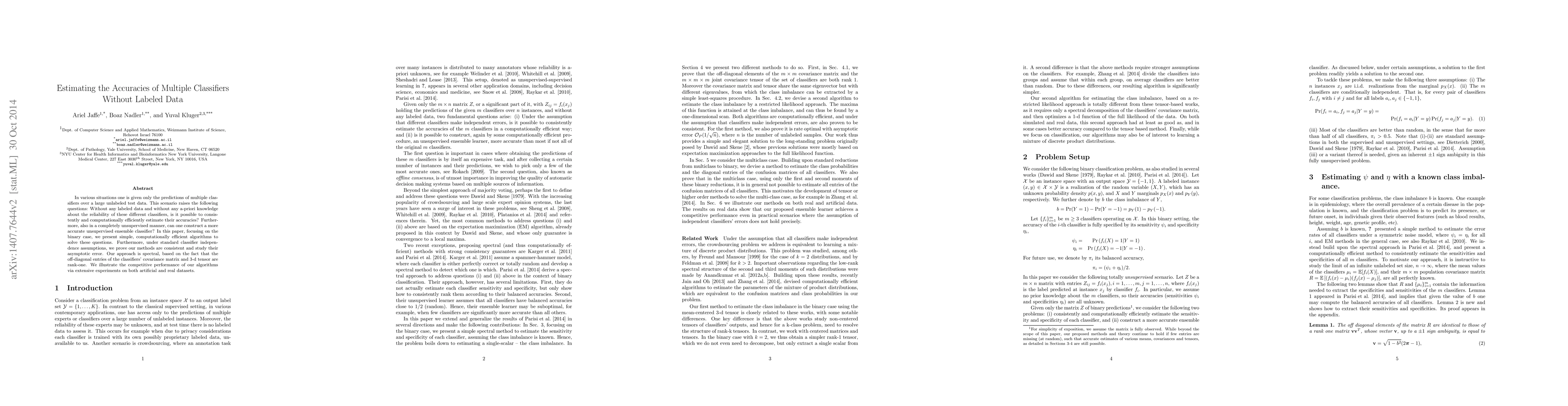 This paper proposes efficient algorithms to estimate the accuracies of multiple classifiers using only their unlabeled predictions, and constructs an unsupervised ensemble classifier without labeled data. The spectral approach leverages the rank-one nature of the classifiers' covariance matrix and 3-d tensor, demonstrating competitive performance in experiments.