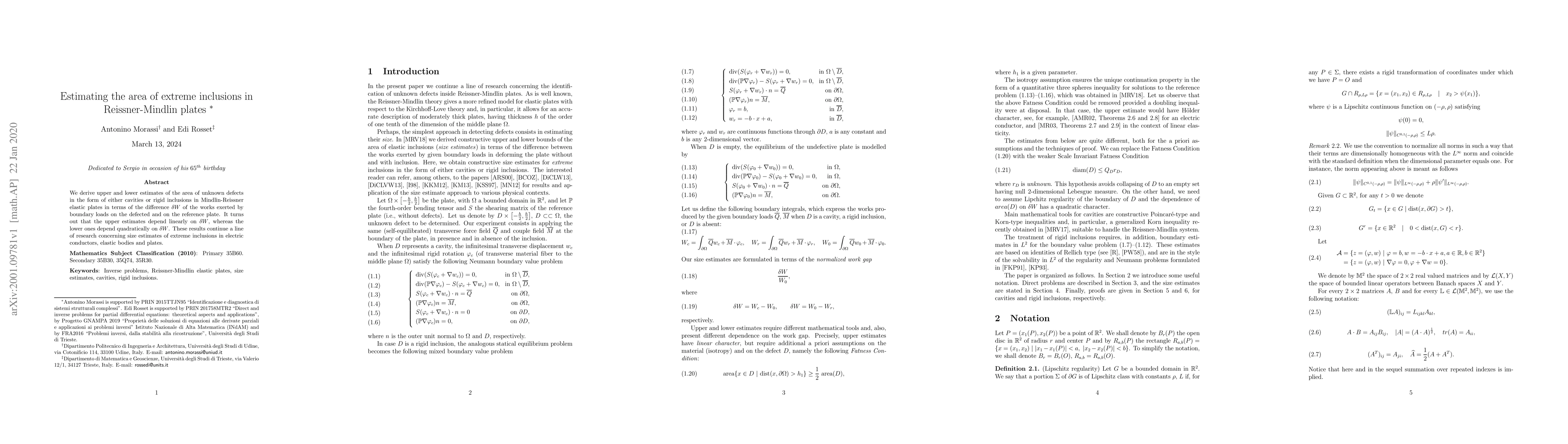 The research derives upper and lower estimates for the area of unknown defects in Reissner-Mindlin elastic plates using the difference δW of the works exerted by boundary loads on the defected and reference plates.