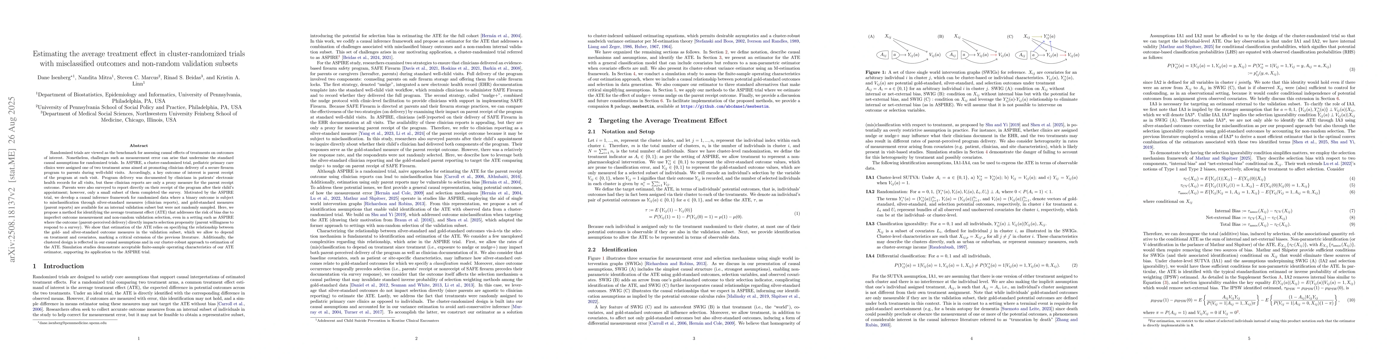 Randomized trials are viewed as the benchmark for assessing causal effects of treatments on outcomes of interest. Nonetheless, challenges such as measurement error can undermine the standard causal assumptions for randomized trials. In ASPIRE, a cluster-randomized trial, pediatric primary care clinics were assigned to one of two treatments aimed at promoting clinician delivery of a secure firearm program to parents during well-child visits. A key outcome of interest is thus parent receipt of the program at each visit. Clinicians documented program delivery in patients' electronic health records for all visits, but their reporting is a proxy measure for the parent receipt outcome. Parents were also surveyed to report directly on program receipt after their child's visit; however, only a small subset of them completed the survey. Here, we develop a causal inference framework for a binary outcome that is subject to misclassification through silver-standard measures (clinician reports), but gold-standard measures (parent reports) are only available for a non-random internal validation subset. We propose a method for identifying the average treatment effect (ATE) that addresses the risk of bias due to misclassification and non-random validation selection, even when the outcome (parent receipt) may directly impact selection propensity (survey responsiveness). We show that ATE estimation relies on specifying the relationship between the gold- and silver-standard outcome measures in the validation subset, which may depend on treatment and covariates. Additionally, the clustered design is reflected in our causal assumptions and in our cluster-robust approach to estimation of the ATE. Simulation studies demonstrate acceptable finite-sample operating characteristics of our ATE estimator, supporting its application to ASPIRE.