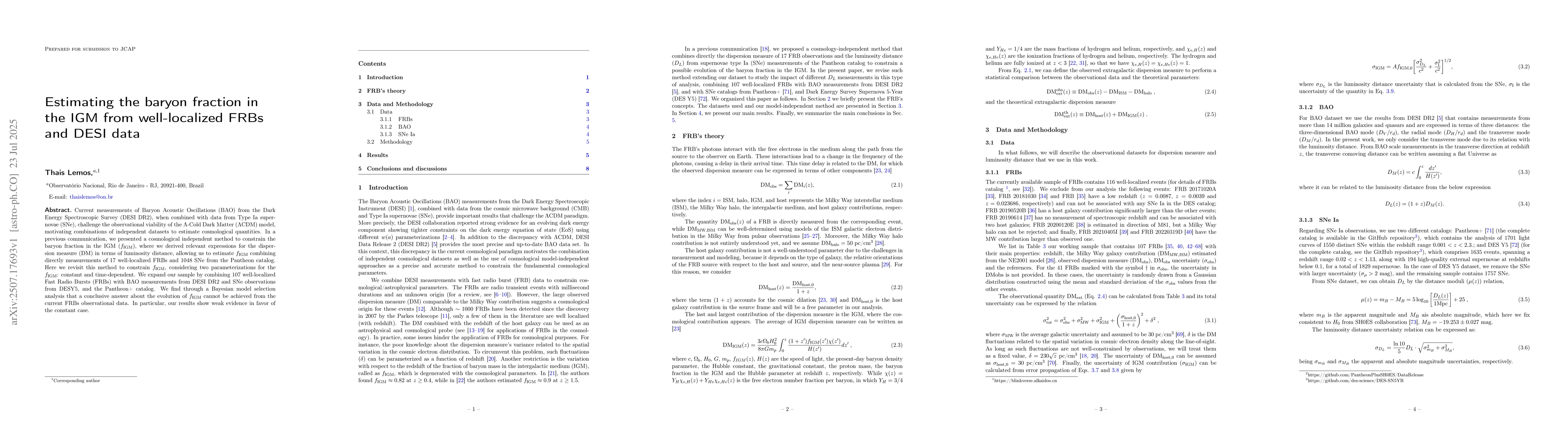 Current measurements of Baryon Acoustic Oscillations (BAO) from the Dark Energy Spectroscopic Survey (DESI DR2), when combined with data from Type Ia supernovae (SNe), challenge the observational viability of the $\Lambda$-Cold Dark Matter ($\Lambda$CDM) model, motivating combinations of independent datasets to estimate cosmological quantities. In a previous communication, we presented a cosmological independent method to constrain the baryon fraction in the IGM ($f_{\mathrm{IGM}}$), where we derived relevant expressions for the dispersion measure ($\mathrm{DM}$) in terms of luminosity distance, allowing us to estimate $f_{\mathrm{IGM}}$ combining directly measurements of 17 well-localized FRBs and 1048 SNe from the Pantheon catalog. Here we revisit this method to constrain $f_{\mathrm{IGM}}$, considering two parameterizations for the $f_{\mathrm{IGM}}$: constant and time-dependent. We expand our sample by combining 107 well-localized Fast Radio Bursts (FRBs) with BAO measurements from DESI DR2 and SNe observations from DESY5, and the Pantheon+ catalog. We find through a Bayesian model selection analysis that a conclusive answer about the evolution of $f_{\mathrm{IGM}}$ cannot be achieved from the current FRBs observational data. In particular, our results show weak evidence in favor of the constant case.
