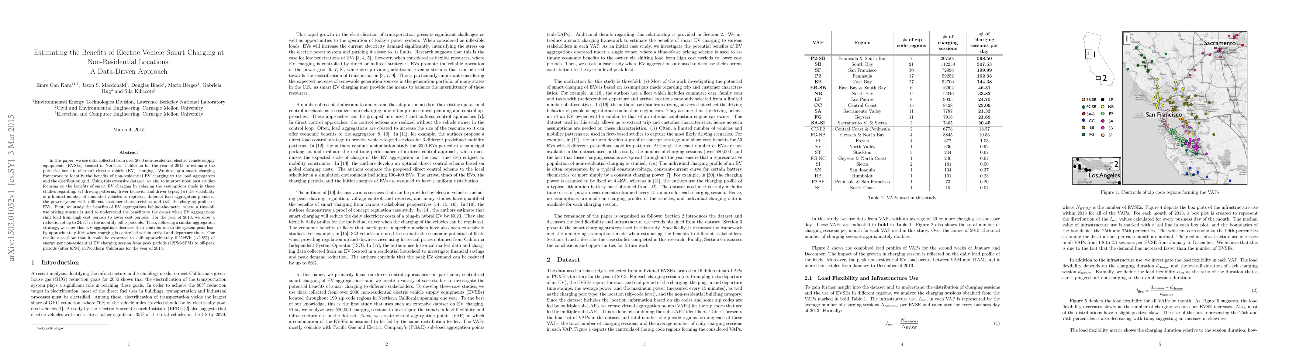 This paper estimates the benefits of smart electric vehicle (EV) charging at non-residential locations using data from over 2000 EVSEs in Northern California in 2013. It shows a potential 24.8% reduction in monthly bills and a 40% decrease in peak load contribution through smart charging strategies.