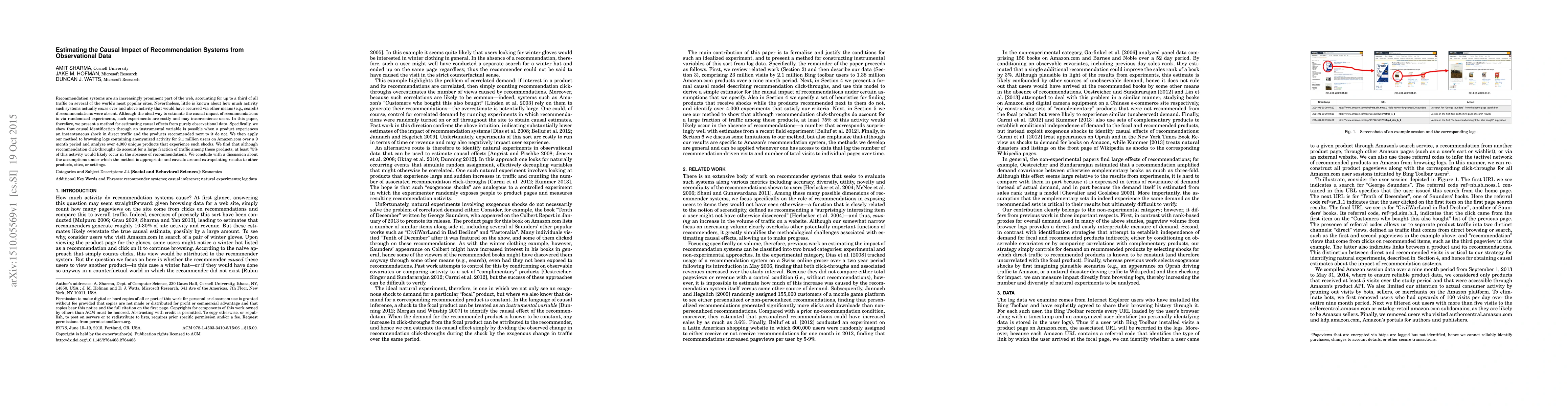 Recommendation systems are an increasingly prominent part of the web, accounting for up to a third of all traffic on several of the world's most popular sites. Nevertheless, little is known about how much activity such systems actually cause over and above activity that would have occurred via other means (e.g., search) if recommendations were absent. Although the ideal way to estimate the causal impact of recommendations is via randomized experiments, such experiments are costly and may inconvenience users. In this paper, therefore, we present a method for estimating causal effects from purely observational data. Specifically, we show that causal identification through an instrumental variable is possible when a product experiences an instantaneous shock in direct traffic and the products recommended next to it do not. We then apply our method to browsing logs containing anonymized activity for 2.1 million users on Amazon.com over a 9 month period and analyze over 4,000 unique products that experience such shocks. We find that although recommendation click-throughs do account for a large fraction of traffic among these products, at least 75% of this activity would likely occur in the absence of recommendations. We conclude with a discussion about the assumptions under which the method is appropriate and caveats around extrapolating results to other products, sites, or settings.