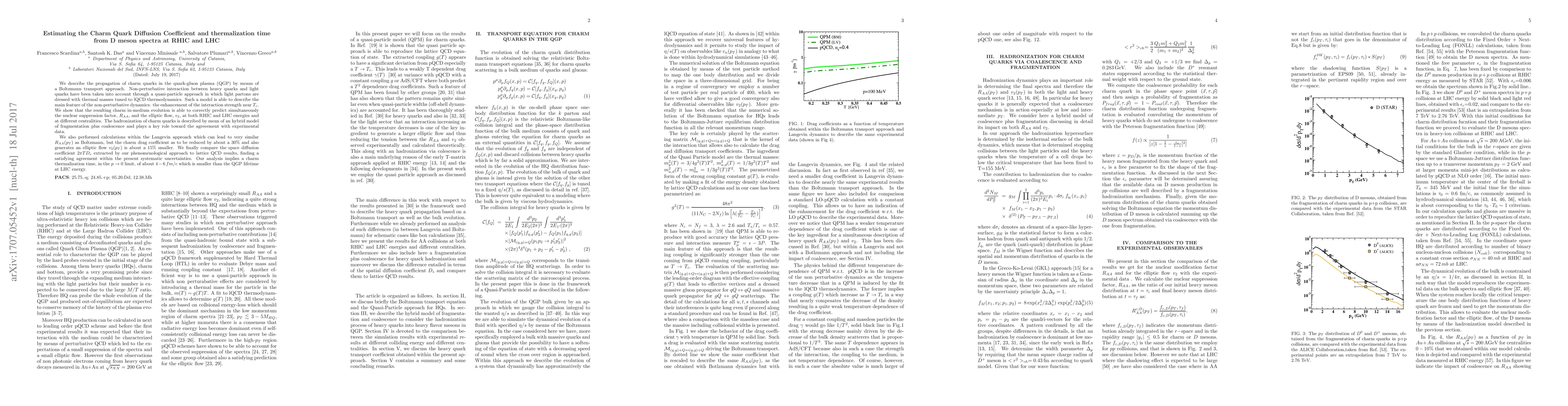 We describe the propagation of charm quarks in the quark-gluon plasma (QGP) by means of a Boltzmann transport approach. Non-perturbative interaction between heavy quarks and light quarks have been taken into account through a quasi-particle approach in which light partons are dressed with thermal masses tuned to lQCD thermodynamics. Such a model is able to describe the main feature of the non-perturbative dynamics: the enhancement of the interaction strength near $T_c$. We show that the resulting charm in-medium evolution is able to correctly predict simultaneously the nuclear suppression factor, $R_{AA}$, and the elliptic flow, $v_2$, at both RHIC and LHC energies and at different centralities. The hadronization of charm quarks is described by mean of an hybrid model of fragmentation plus coalescence and plays a key role toward the agreeement with experimental data. We also performed calculations within the Langevin approach which can lead to very similar $R_{AA}(p_T)$ as Boltzmann, but the charm drag coefficient as to be reduced by about a $30\%$ and also generates an elliptic flow $v_2(p_T)$ is about a $15\%$ smaller. We finally compare the space diffusion coefficient $2\pi TD_s$ extracted by our phenomenological approach to lattice QCD results, finding a satisfying agreement within the present systematic uncertainties. Our analysis implies a charm thermalization time, in the $p\rightarrow 0$ limit, of about $4-6 \, fm/c$ which is smaller than the QGP lifetime at LHC energy.
