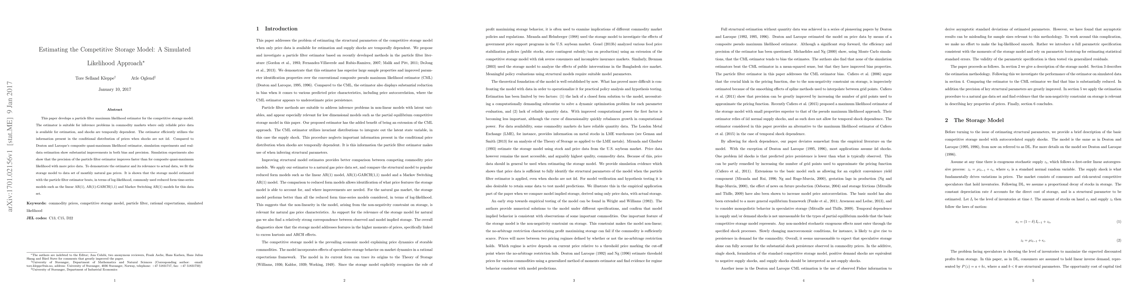 This paper develops a particle filter maximum likelihood estimator for the competitive storage model. The estimator is suitable for inference problems in commodity markets where only reliable price data is available for estimation, and shocks are temporally dependent. The estimator efficiently utilizes the information present in the conditional distribution of prices when shocks are not iid. Compared to Deaton and Laroque's composite quasi-maximum likelihood estimator, simulation experiments and real-data estimation show substantial improvements in both bias and precision. Simulation experiments also show that the precision of the particle filter estimator improves faster than for composite quasi-maximum likelihood with more price data. To demonstrate the estimator and its relevance to actual data, we fit the storage model to data set of monthly natural gas prices. It is shown that the storage model estimated with the particle filter estimator beats, in terms of log-likelihood, commonly used reduced form time-series models such as the linear AR(1), AR(1)-GARCH(1,1) and Markov Switching AR(1) models for this data set.