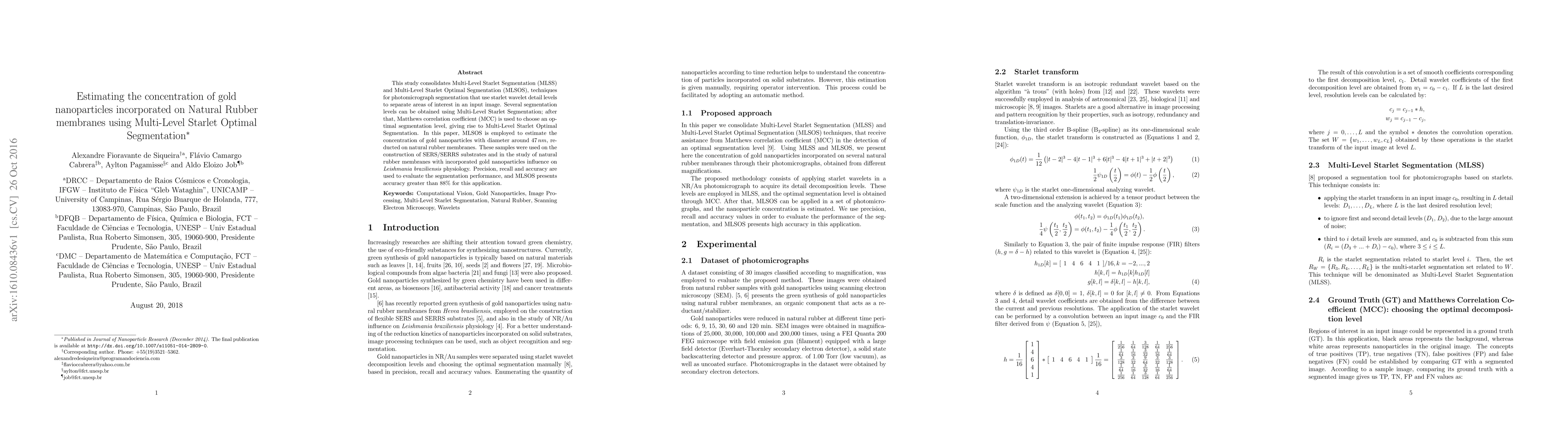This study consolidates Multi-Level Starlet Segmentation (MLSS) and Multi-Level Starlet Optimal Segmentation (MLSOS), techniques for photomicrograph segmentation that use starlet wavelet detail levels to separate areas of interest in an input image. Several segmentation levels can be obtained using Multi-Level Starlet Segmentation; after that, Matthews correlation coefficient (MCC) is used to choose an optimal segmentation level, giving rise to Multi-Level Starlet Optimal Segmentation. In this paper, MLSOS is employed to estimate the concentration of gold nanoparticles with diameter around 47 nm, reducted on natural rubber membranes. These samples were used on the construction of SERS/SERRS substrates and in the study of natural rubber membranes with incorporated gold nanoparticles influence on Leishmania braziliensis physiology. Precision, recall and accuracy are used to evaluate the segmentation performance, and MLSOS presents accuracy greater than 88% for this application.