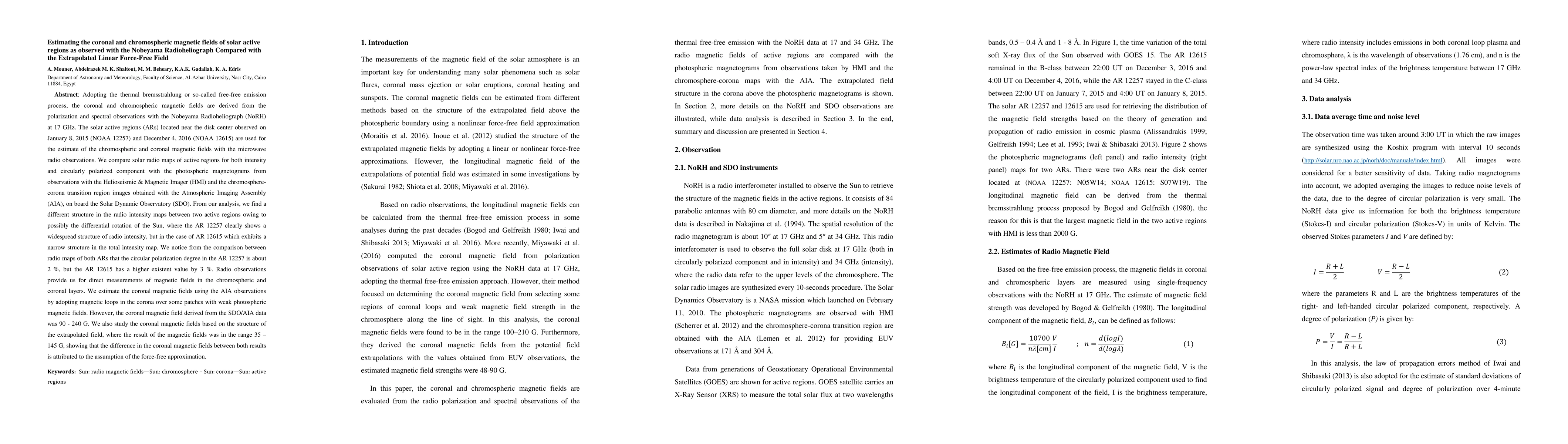 Adopting the thermal free-free emission mechanism, the coronal and chromospheric magnetic fields are derived from the polarization and spectral observations with the Nobeyama Radioheliograph at 1.76 cm. The solar active regions (AR) located near the disk center observed on January 8, 2015 (AR 12257) and December 4, 2016 (AR 12615) are used for the estimate of the chromospheric and coronal magnetic fields with the microwave radio observations. We compare solar radio maps of active regions for both intensity and circularly polarized component with the optical maps from observations with the Helioseismic and Magnetic Imager and the chromosphere and corona transition region images obtained with the Atmospheric Imaging Assembly instrument, on board the Solar Dynamic Observatory. We notice from the comparison between radio maps of both AR that the circular polarization degree in the AR 12257 is about 2 percent, but the AR 12615 has a higher existent value by 3 percent. Radio observations provide us for direct measurements of magnetic fields in the chromospheric and coronal layers. We estimate the coronal magnetic fields using the Atmospheric Imaging Assembly observations by adopting magnetic loops in the corona over some patches with weak photospheric magnetic fields. The coronal magnetic field derived from the Atmospheric Imaging Assembly data was from 90 to 240 Gauss. We also study the coronal magnetic fields based on the structure of the extrapolated field, where the result of the magnetic fields was in the range from 35 to 145 Gauss, showing that the difference in the coronal magnetic fields between both results is attributed to the assumption of the force-free approximation.