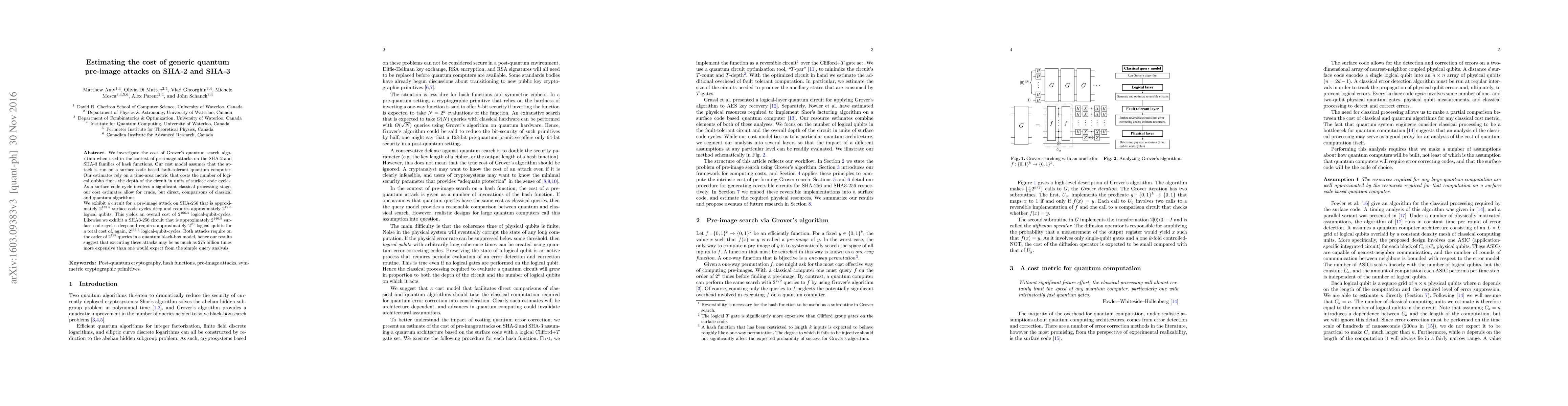 We investigate the cost of Grover's quantum search algorithm when used in the context of pre-image attacks on the SHA-2 and SHA-3 families of hash functions. Our cost model assumes that the attack is run on a surface code based fault-tolerant quantum computer. Our estimates rely on a time-area metric that costs the number of logical qubits times the depth of the circuit in units of surface code cycles. As a surface code cycle involves a significant classical processing stage, our cost estimates allow for crude, but direct, comparisons of classical and quantum algorithms. We exhibit a circuit for a pre-image attack on SHA-256 that is approximately $2^{153.8}$ surface code cycles deep and requires approximately $2^{12.6}$ logical qubits. This yields an overall cost of $2^{166.4}$ logical-qubit-cycles. Likewise we exhibit a SHA3-256 circuit that is approximately $2^{146.5}$ surface code cycles deep and requires approximately $2^{20}$ logical qubits for a total cost of, again, $2^{166.5}$ logical-qubit-cycles. Both attacks require on the order of $2^{128}$ queries in a quantum black-box model, hence our results suggest that executing these attacks may be as much as $275$ billion times more expensive than one would expect from the simple query analysis.