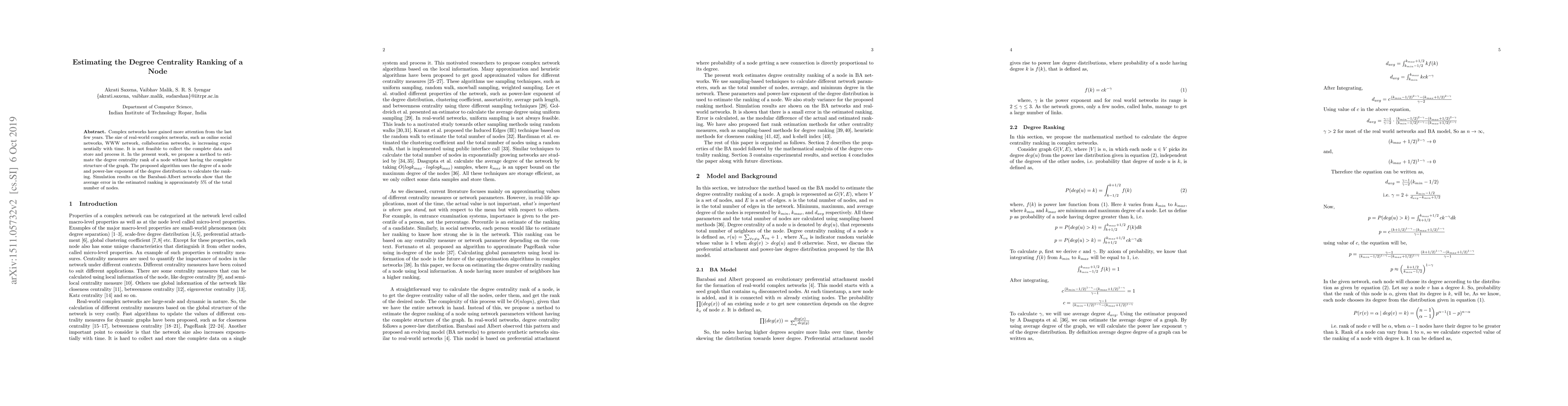 Complex networks have gained more attention from the last few years. The size of real-world complex networks, such as online social networks, WWW network, collaboration networks, is increasing exponentially with time. It is not feasible to collect the complete data and store and process it. In the present work, we propose a method to estimate the degree centrality rank of a node without having the complete structure of the graph. The proposed algorithm uses the degree of a node and power-law exponent of the degree distribution to calculate the ranking. Simulation results on the Barabasi-Albert networks show that the average error in the estimated ranking is approximately $5\%$ of the total number of nodes.