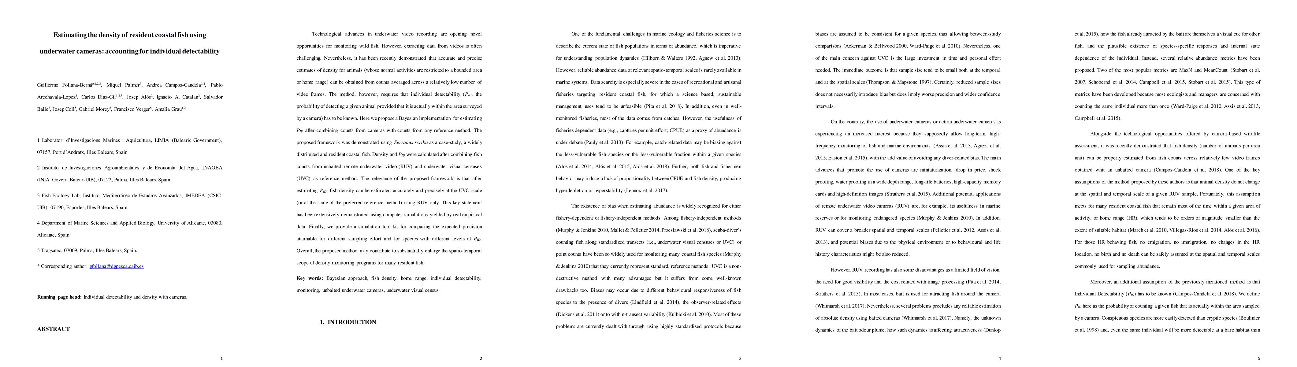 Technological advances in underwater video recording are opening novel opportunities for monitoring wild fish. However, extracting data from videos is often challenging. Nevertheless, it has been recently demonstrated that accurate and precise estimates of density for animals (whose normal activities are restricted to a bounded area or home range) can be obtained from counts averaged across a relatively low number of video frames. The method, however, requires that individual detectability (PID, the probability of detecting a given animal provided that it is actually within the area surveyed by a camera) has to be known. Here we propose a Bayesian implementation for estimating PID after combining counts from cameras with counts from any reference method. The proposed framework was demonstrated using Serranus scriba as a case-study, a widely distributed and resident coastal fish. Density and PID were calculated after combining fish counts from unbaited remote underwater video (RUV) and underwater visual censuses (UVC) as reference method. The relevance of the proposed framework is that after estimating PID, fish density can be estimated accurately and precisely at the UVC scale (or at the scale of the preferred reference method) using RUV only. This key statement has been extensively demonstrated using computer simulations yielded by real empirical data. Finally, we provide a simulation tool-kit for comparing the expected precision attainable for different sampling effort and for species with different levels of PID. Overall, the proposed method may contribute to substantially enlarge the spatio-temporal scope of density monitoring programs for many resident fish.