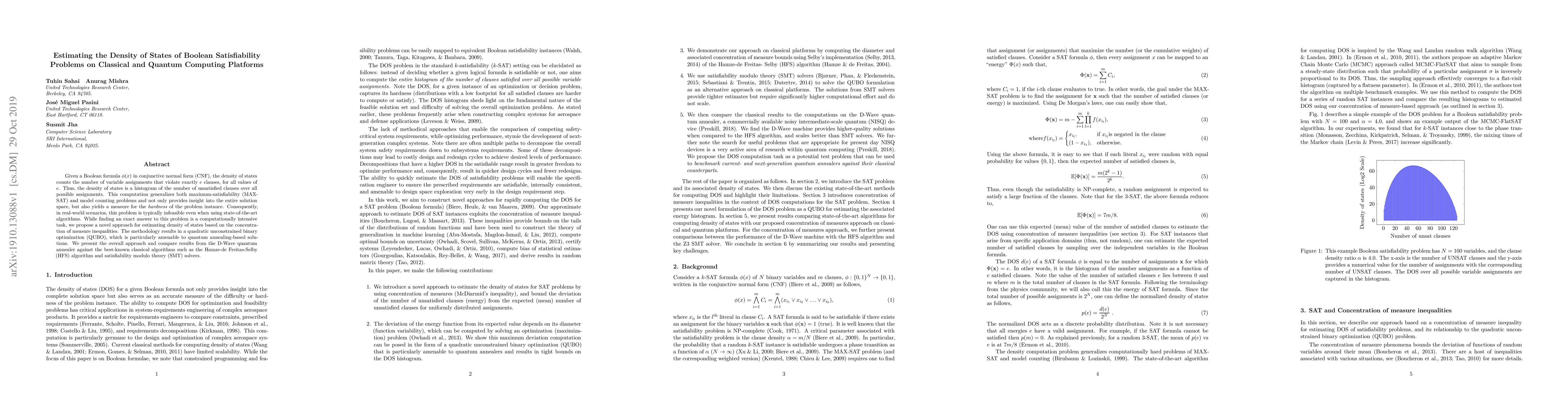 This paper proposes a novel approach to estimate the density of states for Boolean satisfiability problems using concentration of measure inequalities, transforming the problem into a quadratic unconstrained binary optimization (QUBO) suitable for quantum annealing. The study compares results from a D-Wave quantum annealer with classical algorithms like the HFS algorithm and SMT solvers.