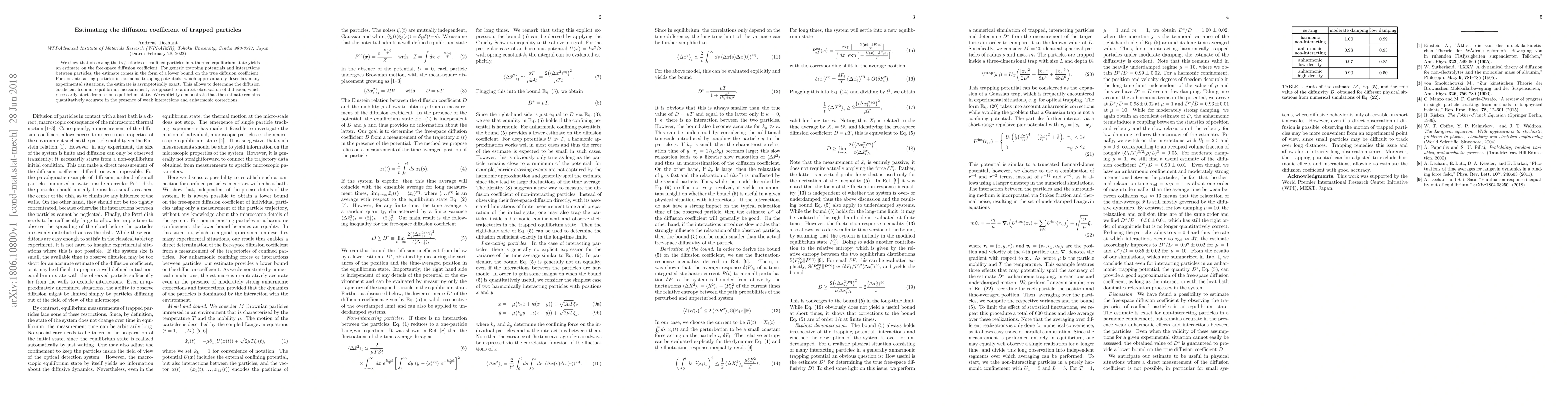 We show that observing the trajectories of confined particles in a thermal equilibrium state yields an estimate on the free-space diffusion coefficient. For generic trapping potentials and interactions between particles, the estimate comes in the form of a lower bound on the true diffusion coefficient. For non-interacting particles in harmonic trapping potentials, which approximately describes many experimental situations, the estimate is asymptotically exact. This allows to determine the diffusion coefficient from an equilibrium measurement, as opposed to a direct observation of diffusion, which necessarily starts from a non-equilibrium state. We explicitly demonstrate that the estimate remains quantitatively accurate in the presence of weak interactions and anharmonic corrections.