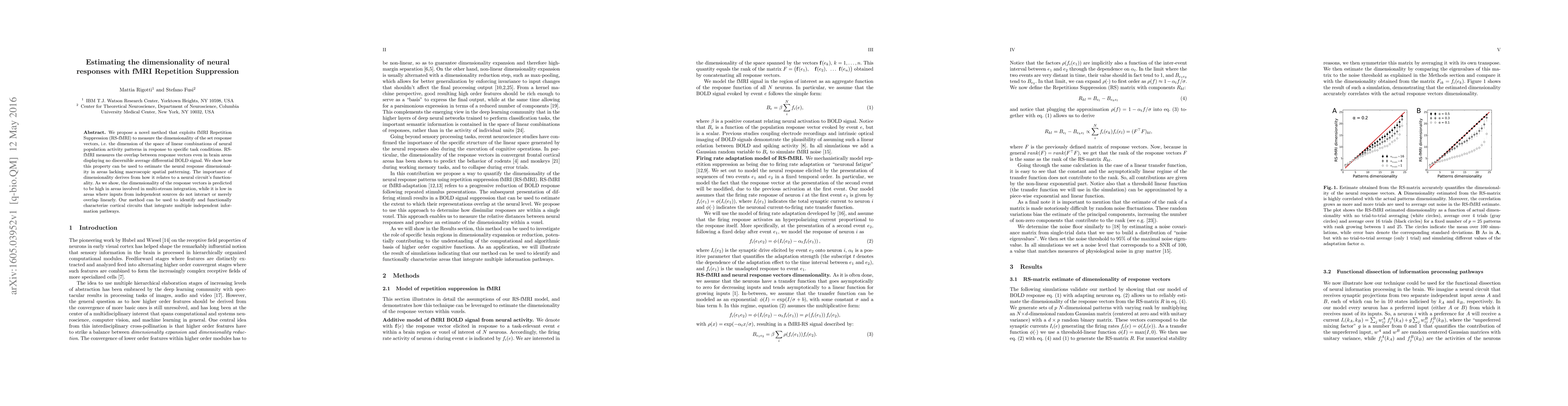 We propose a novel method that exploits fMRI Repetition Suppression (RS-fMRI) to measure the dimensionality of the set response vectors, i.e. the dimension of the space of linear combinations of neural population activity patterns in response to specific task conditions. RS-fMRI measures the overlap between response vectors even in brain areas displaying no discernible average differential BOLD signal. We show how this property can be used to estimate the neural response dimensionality in areas lacking macroscopic spatial patterning. The importance of dimensionality derives from how it relates to a neural circuit's functionality. As we show, the dimensionality of the response vectors is predicted to be high in areas involved in multi-stream integration, while it is low in areas where inputs from independent sources do not interact or merely overlap linearly. Our method can be used to identify and functionally characterize cortical circuits that integrate multiple independent information pathways.