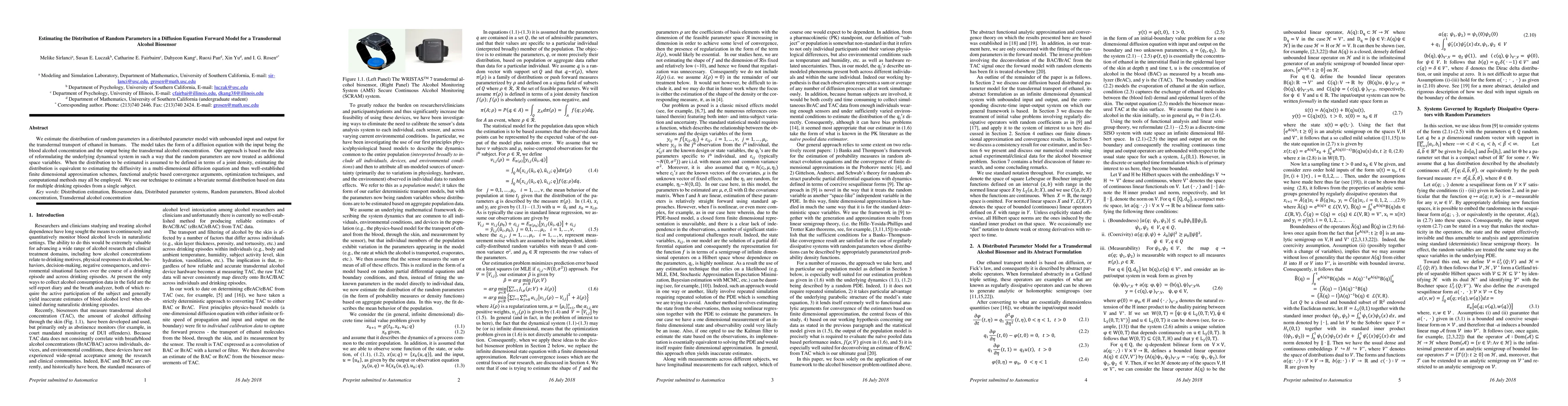 This paper estimates the distribution of random parameters in a diffusion equation model for transdermal alcohol biosensor data, reformulating the model to treat random parameters as additional space variables. The authors employ established finite dimensional approximation schemes and computational methods to estimate a bivariate normal distribution based on data from multiple drinking episodes.